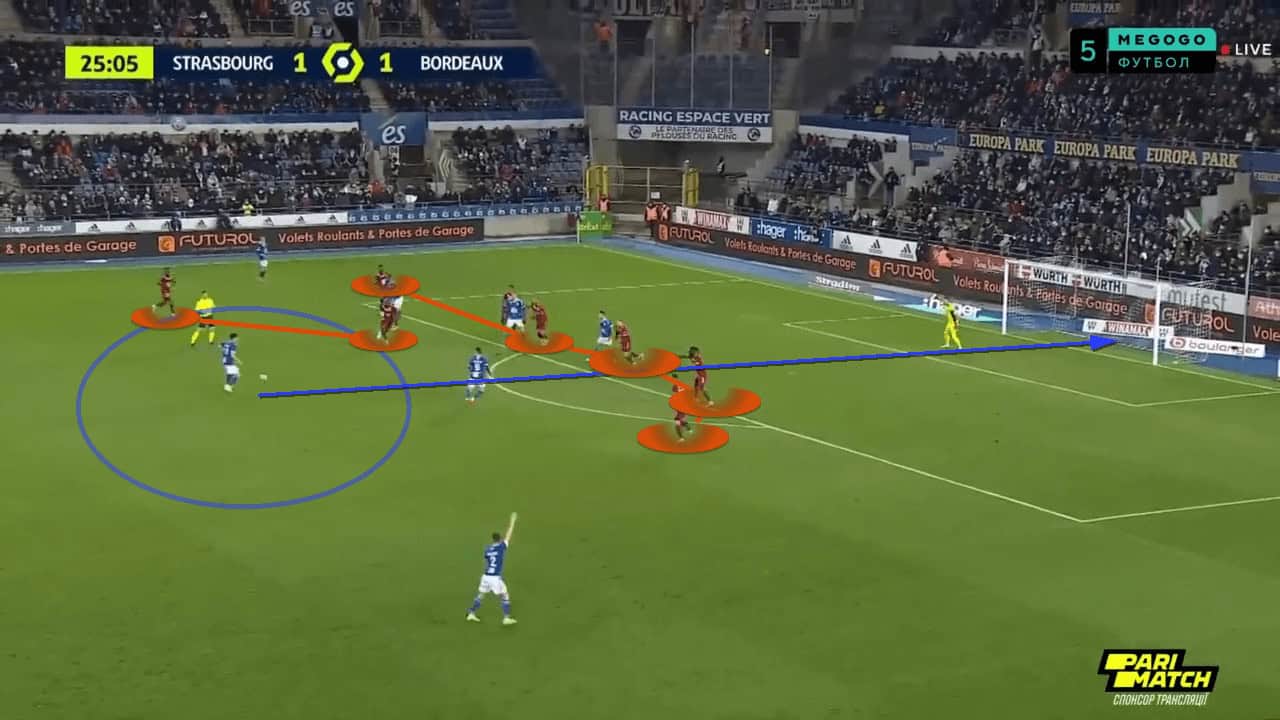 A low block is not something that Bordeaux always came up against. A lot of the success Bordeaux had was from direct counterattacks where passes could be made into space in behind for the attackers to run onto a pass and be 1v1 with the goalkeeper.