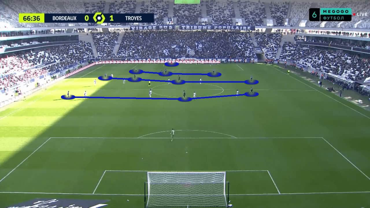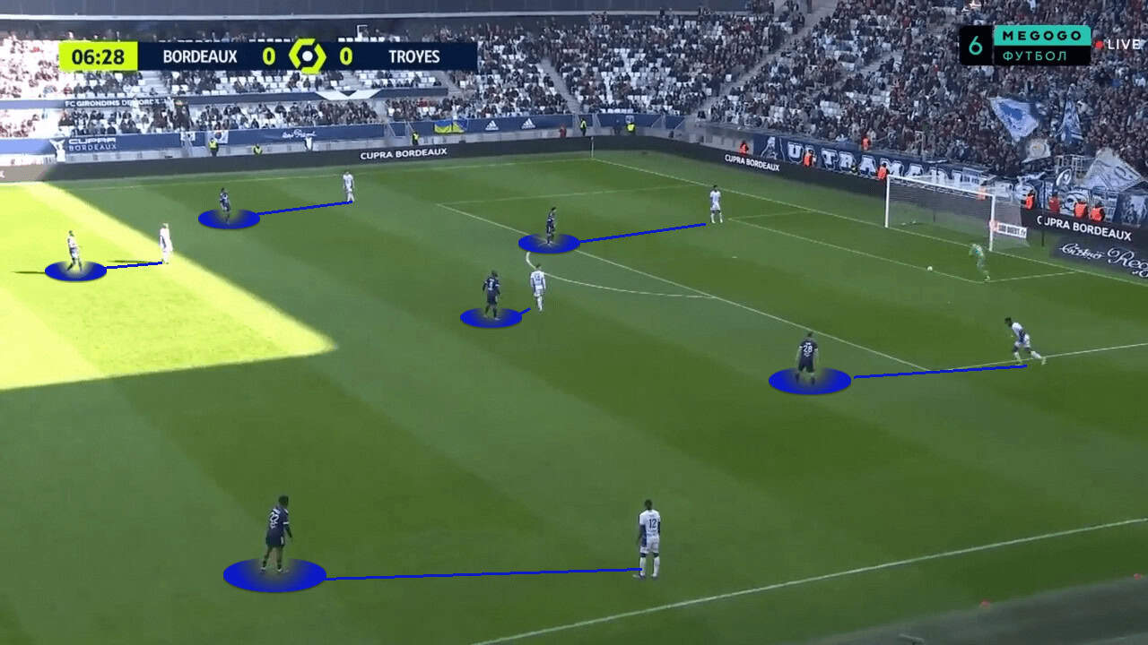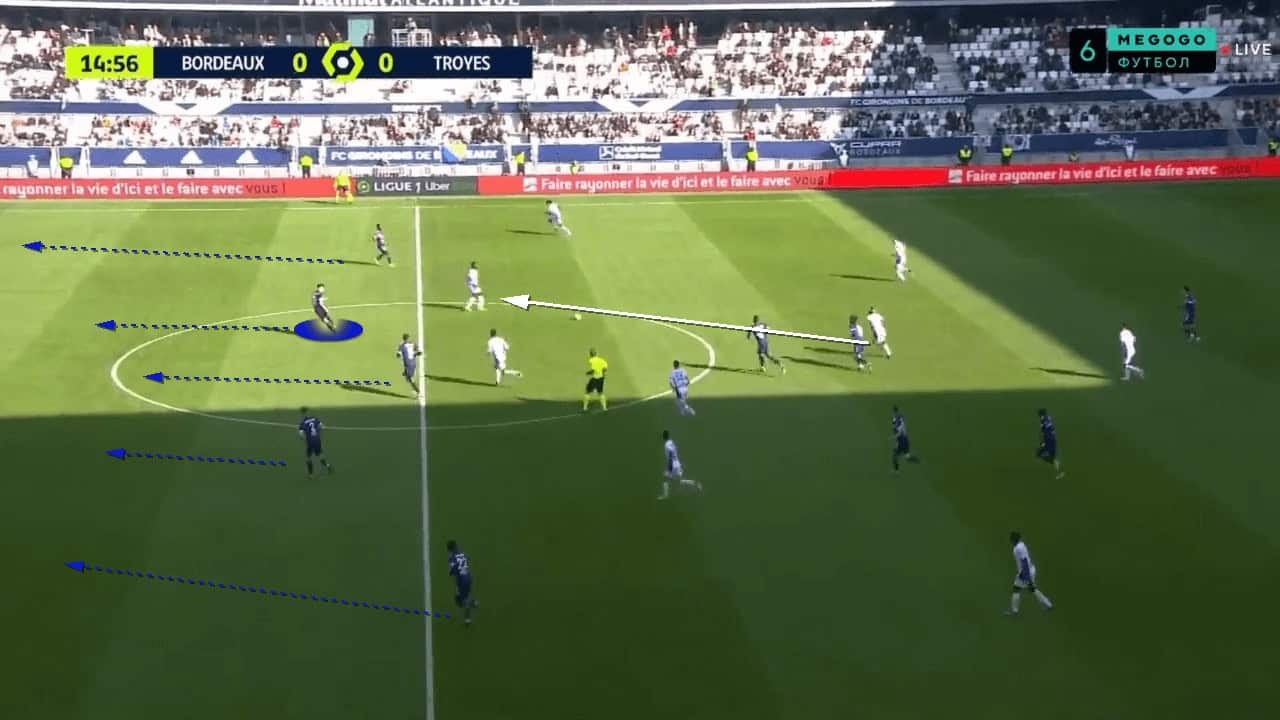Bordeaux were encouraged to try to play out from the back and had the players in positions that enabled them to play out with regular success. The three players further up acted as outlets to allow for long balls, but the overload in the first phase meant Bordeaux were able to keep more possession of the ball.