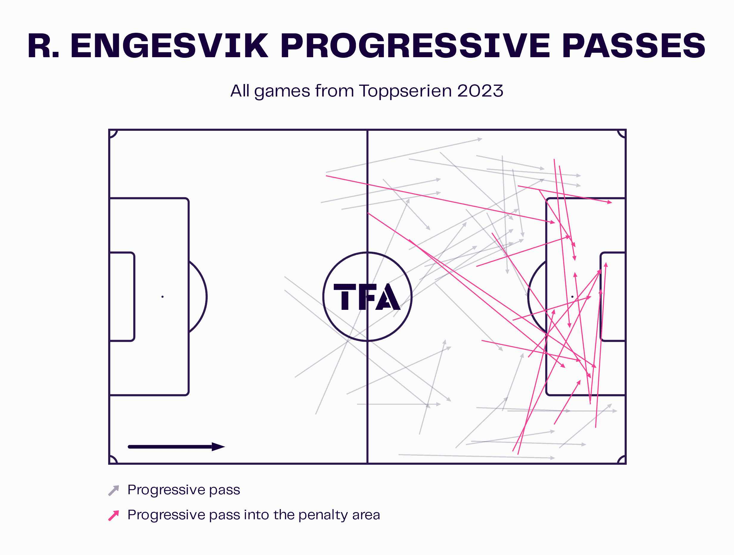 However, it is essential to note that making the shorter passing sequences required to find those players does rely on the player in the middle having the composure to connect the play in the right way, and there is no doubt that Engesvik has that when watching her play. During Brann’s matches, she rarely has a fixed role in the side, instead tending to roam around and pass the ball from many different field areas. This graphic indicates how many passes she has made and the variety of positions she has taken.