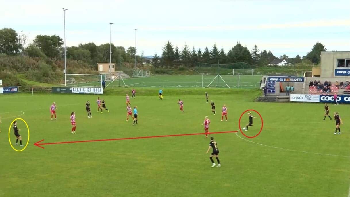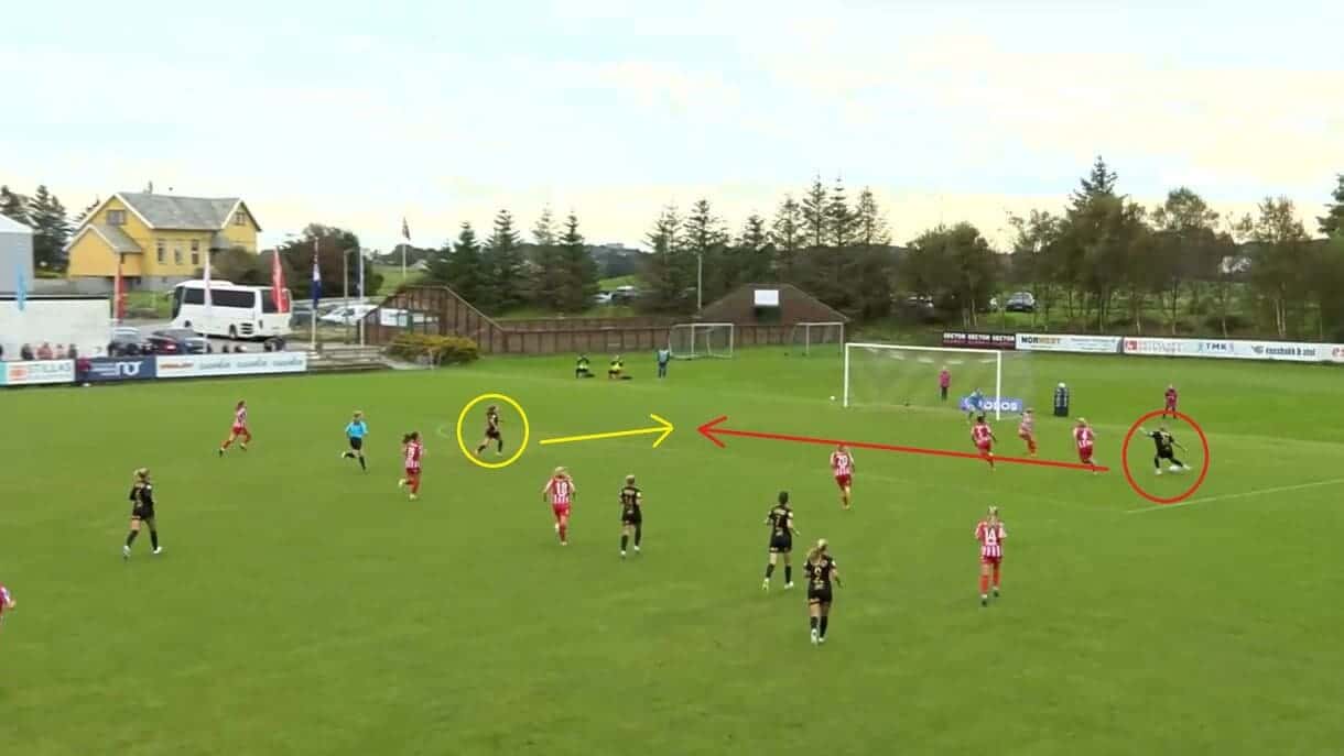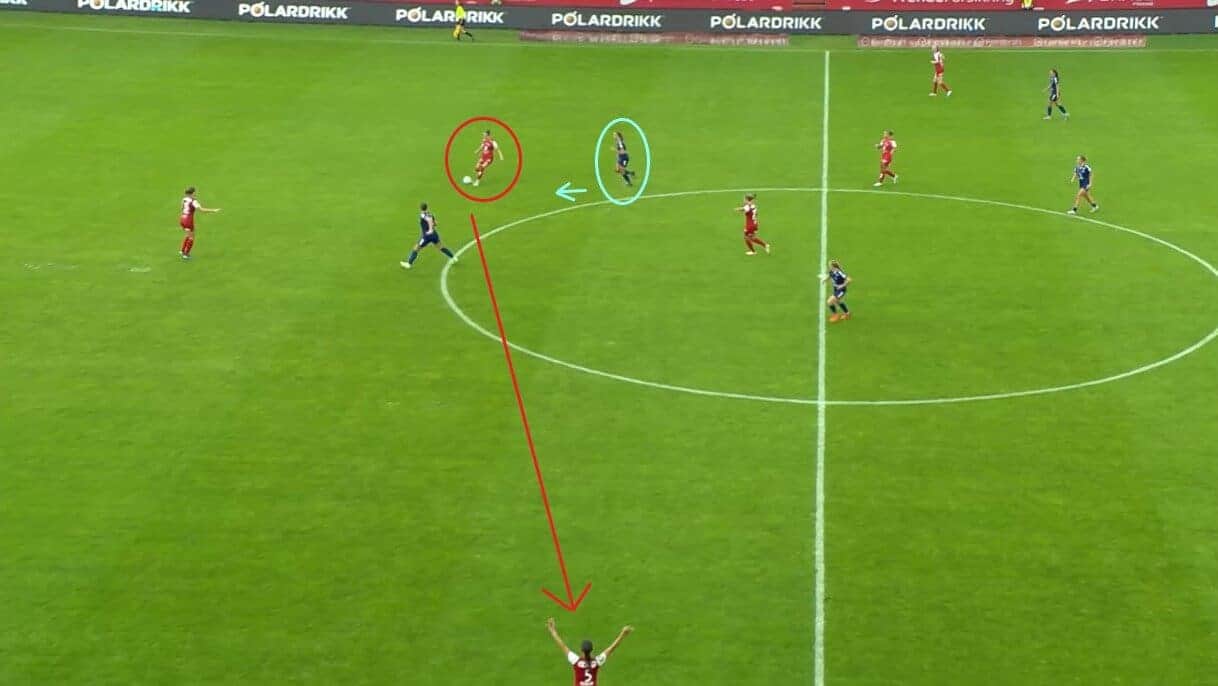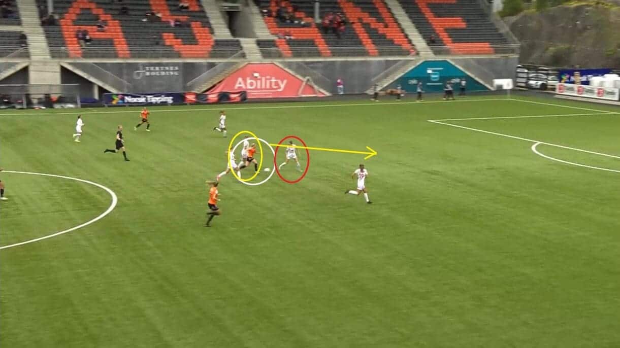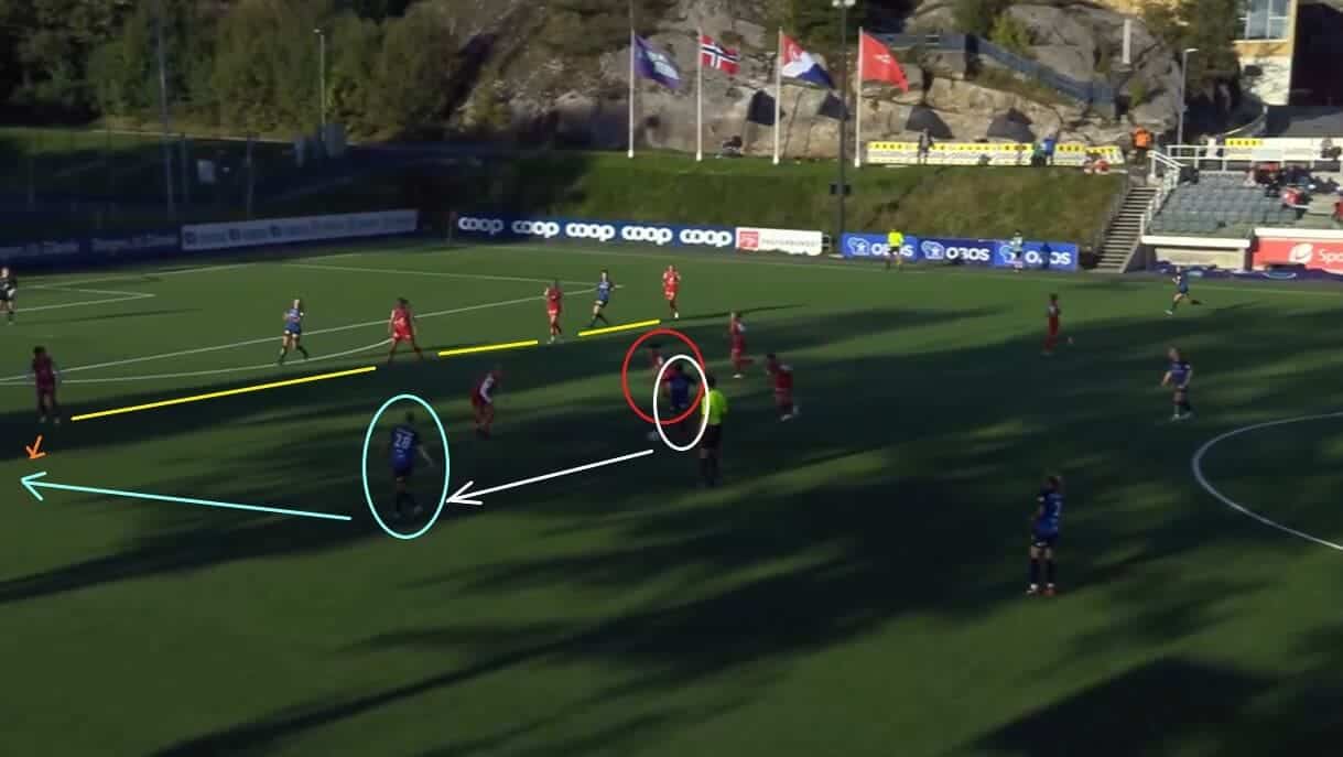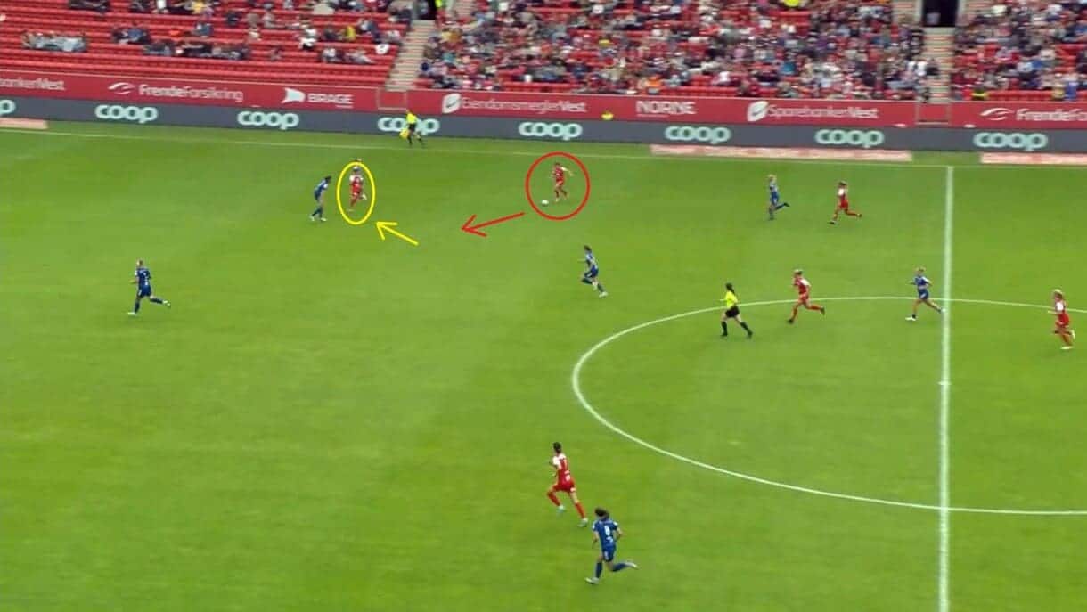 It is not only in the final third that Brann show patience on the ball, though, with there also being occasions when they have had it further back and have demonstrated the same qualities. In this case, defender Nora Eide Lie has possession inside her own half and is looking to launch an attack, and it is clear that Stenevik is open on the near side of the pitch and is in the perfect place to receive the ball and to play it forward.