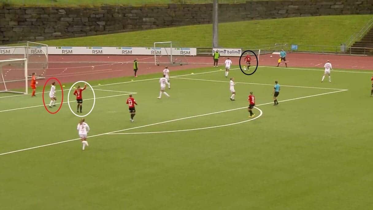 To assist her teammate, Engesvik drifts towards the edge of the goal area as if to give the impression that she will again offer a link between the two players, which Lyn fall for as they commit all three of Jensen, Julie Aune Jorde and Selma Ørstavik Hernes to closing her down and taking her out of the game.