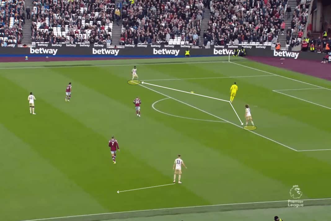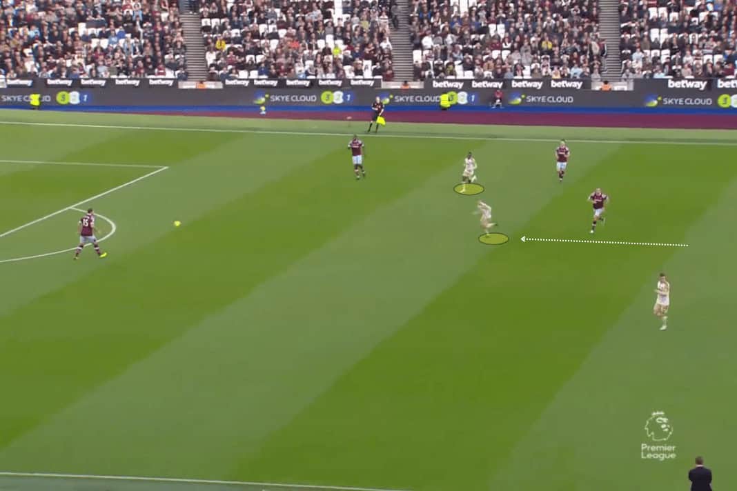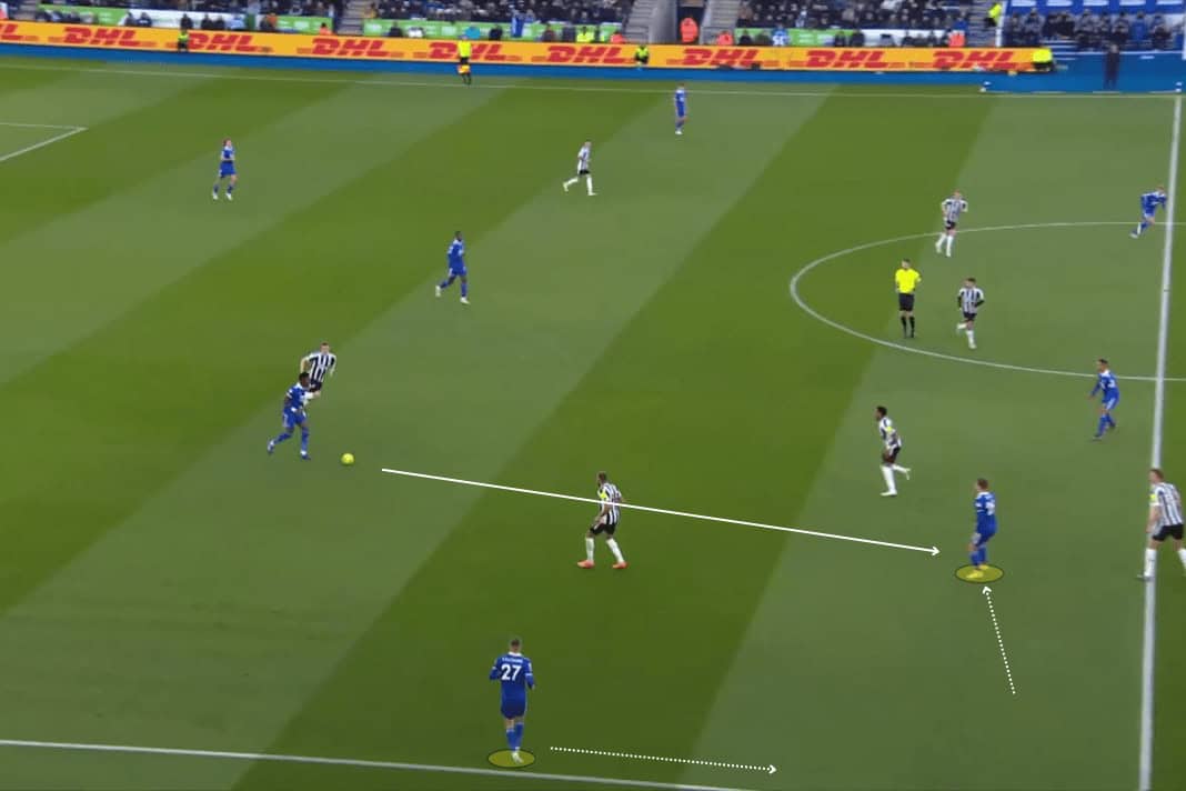 This allows for his wingers to make inverted runs between the fullback and centre-backs as Harvey Barnes has done at Leicester, or conversely, having the wingers drop into the half spaces in midfield to overload and receive between the lines like James Maddison does on the opposite wing.