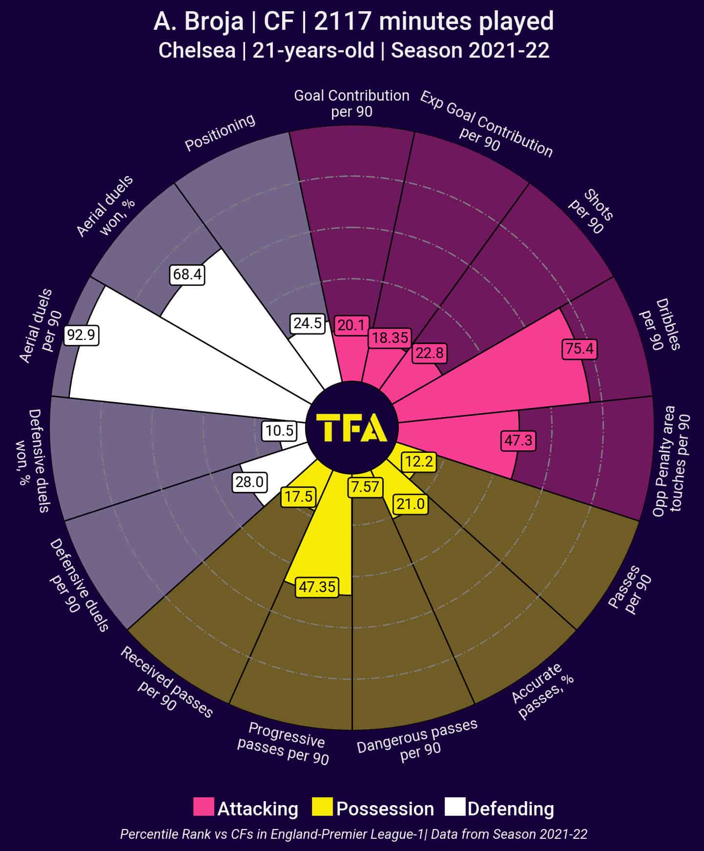 After an impressive loan spell away to Southampton last season (data above showing 2021-2022 season), it was no surprise to many the interest Armando Broja garnered as a physical and direct centre-forward.
