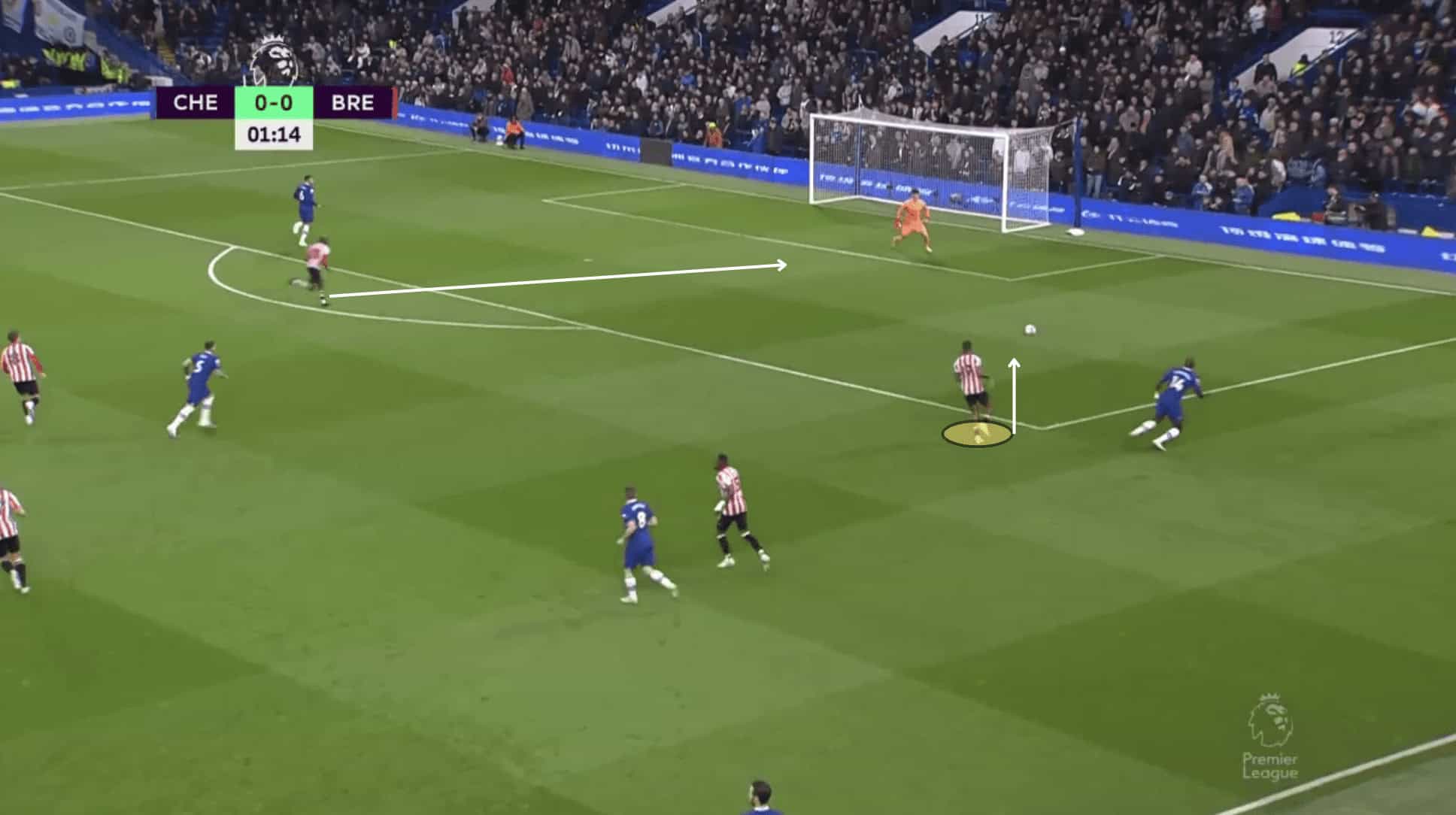 Another component of this effective play is Brentford’s use of their wide players working in tandem with Toney.