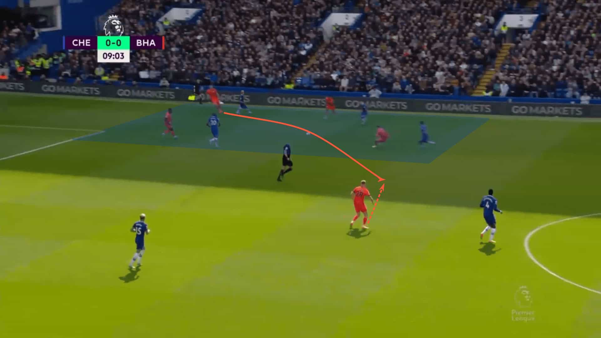 A simple pass forward into Pascal Groß got the ball to the free man, Webster, who beat Chelsea’s first two lines with an incisive pass into the central channel.