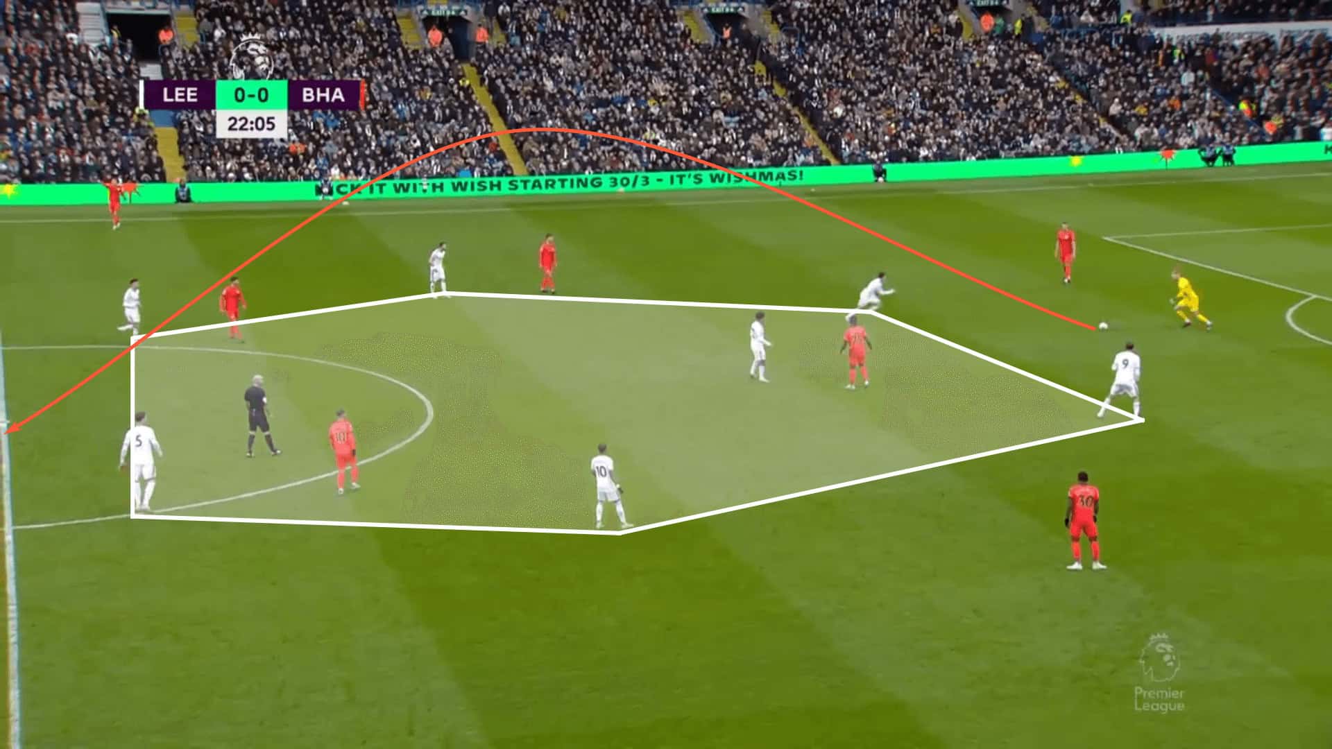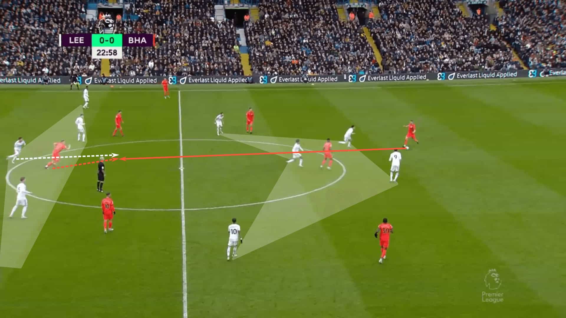 The advantage gained from this last image is that Leeds is well-positioned to defend against the long pass.