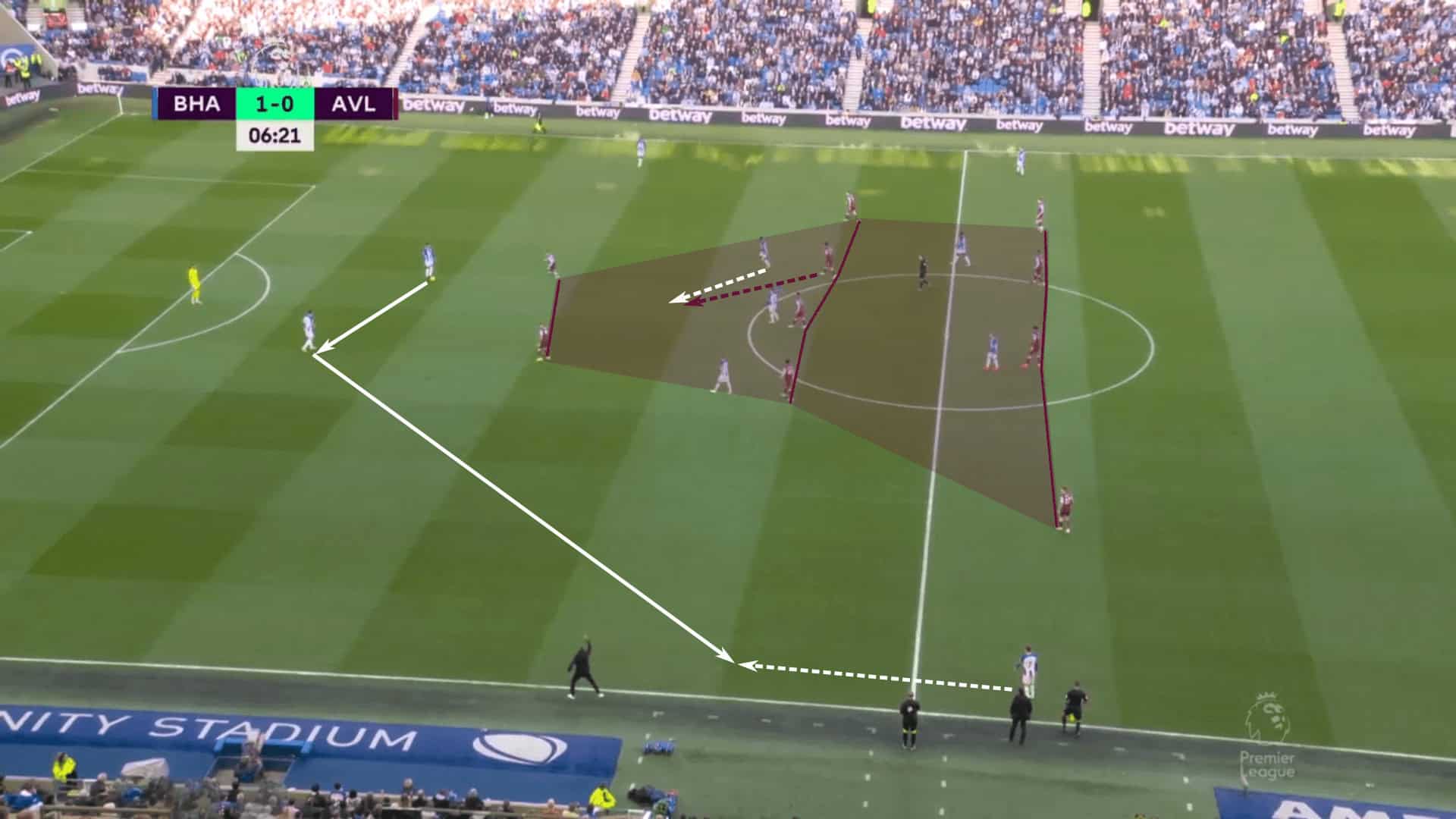 With Brighton in a 2-3-2-3 build-up shape, the Villans shadow-marked the inverted outside-backs and invited the central pass by initially giving Brighton space to play into.