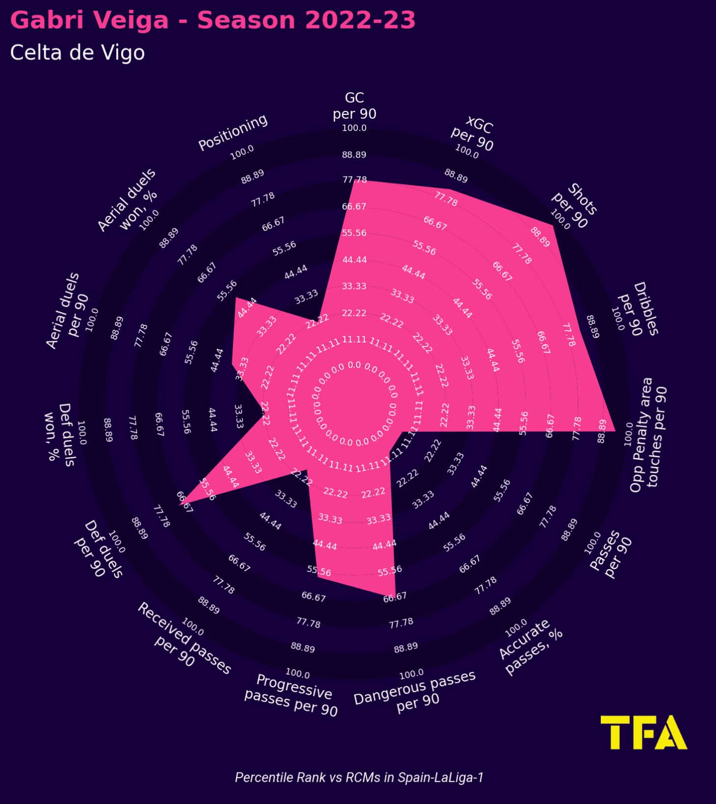 However, since joining Celta Vigo, he has switched to a classic 4-4-2 formation (used 4-4-2 in the last 14 games in La Liga, as per Wyscout) that focuses on fast attacks and quick transitions to reach the goal.
