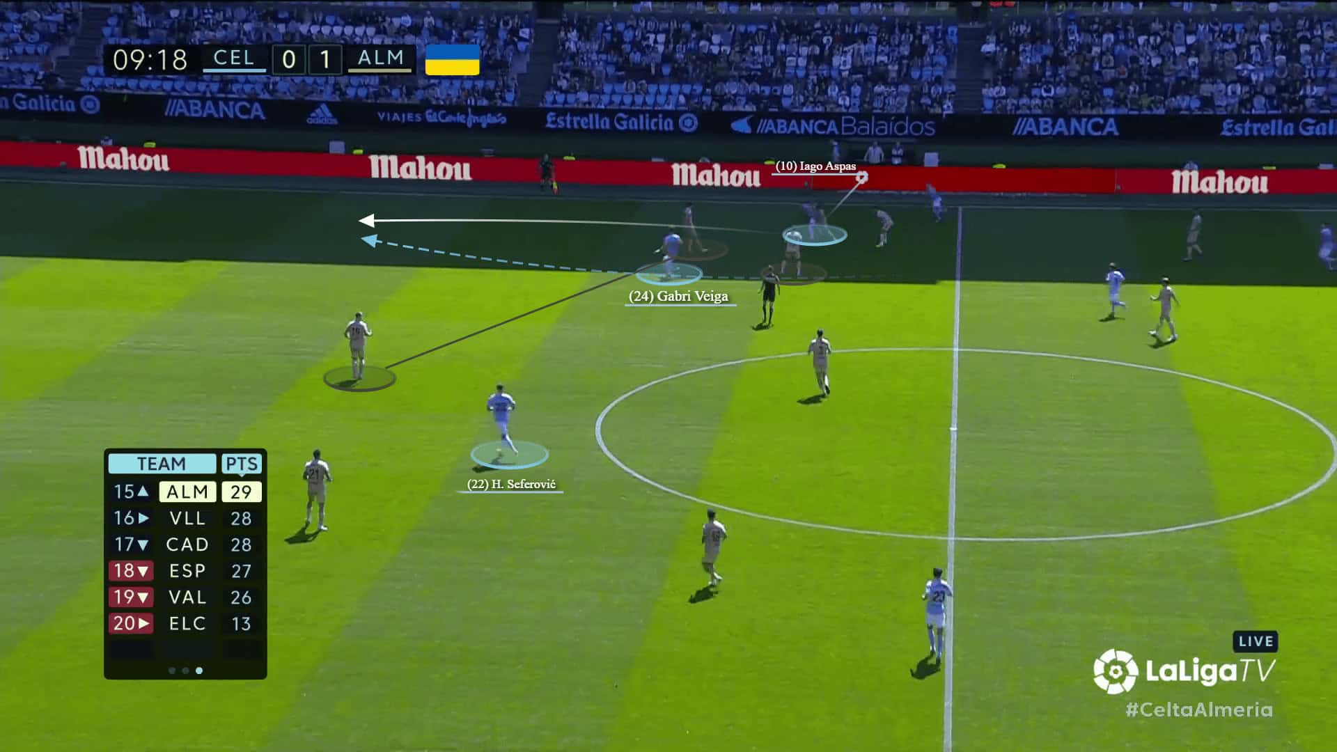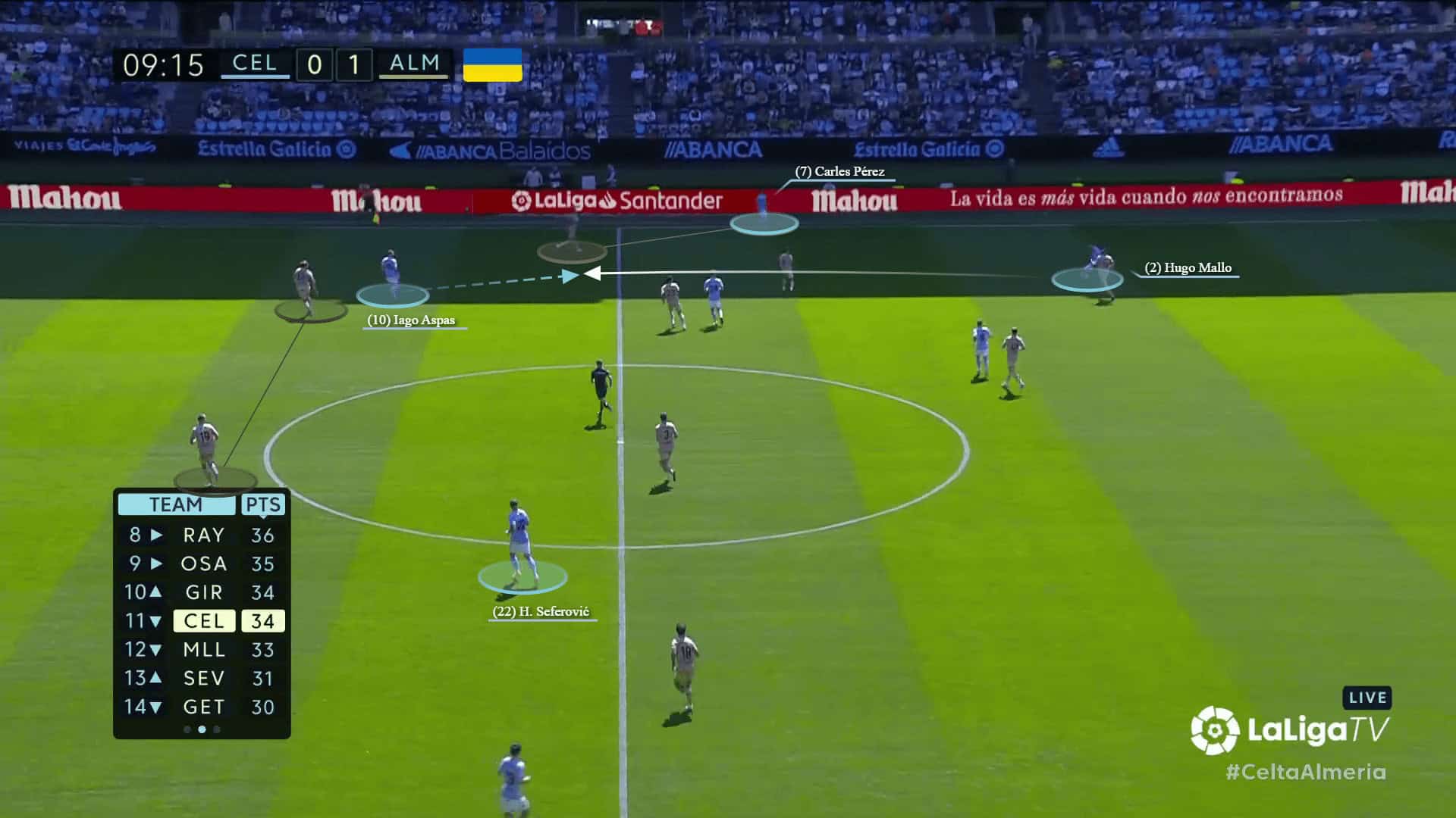 After Mallo progressed, he played a straight pass to the mobile striker Iago Aspas, who had dropped deep into space while Almería’s left back was busy with the right midfielder Carles Perez.