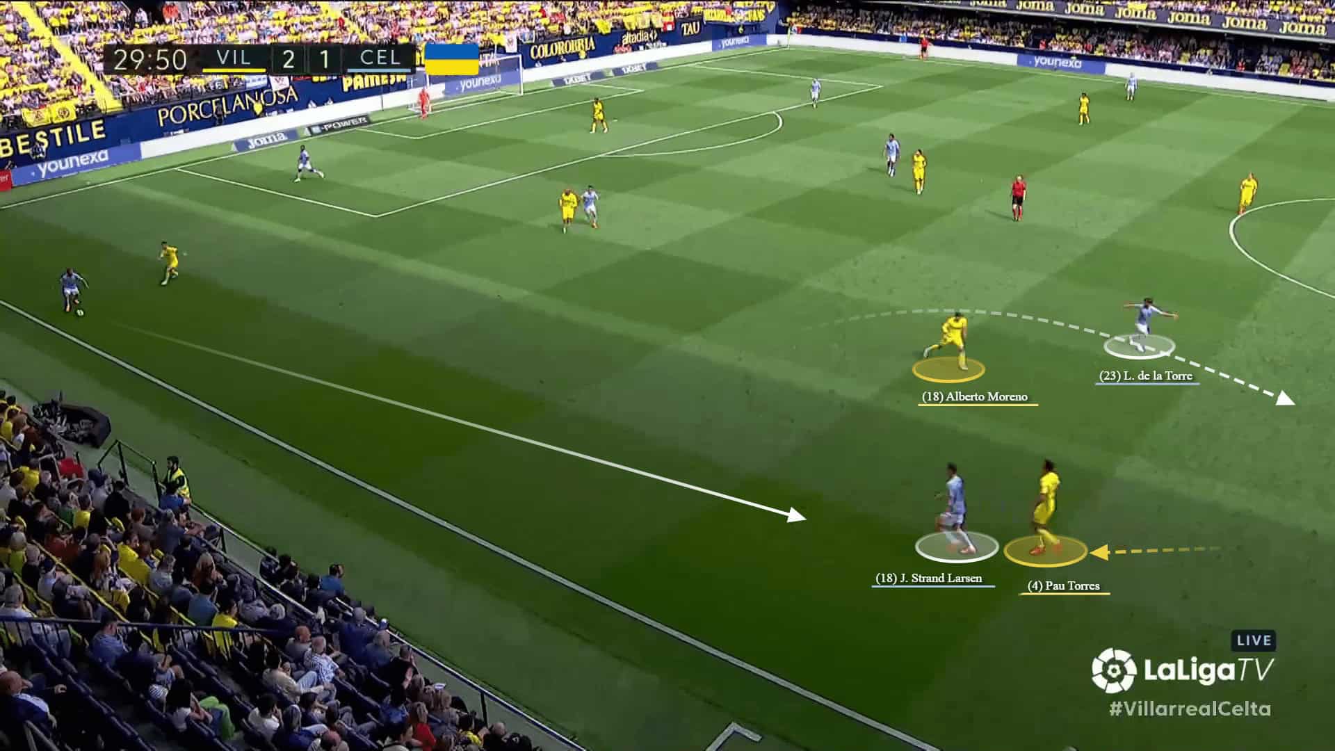 At the same time, Luca De La Torre’s initial static positioning was effective in pulling Villarreal’s left-back, Alberto Moreno, inside, which created space for the striker to drop off and receive, dragging his marker deeper and opening up gaps.