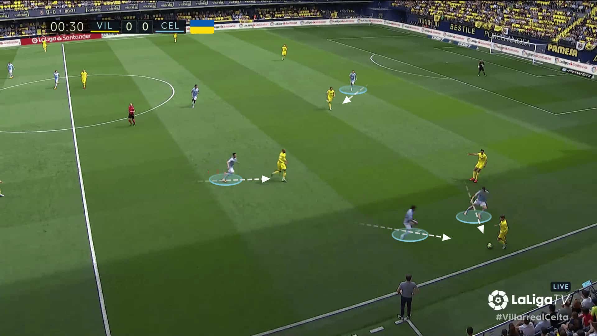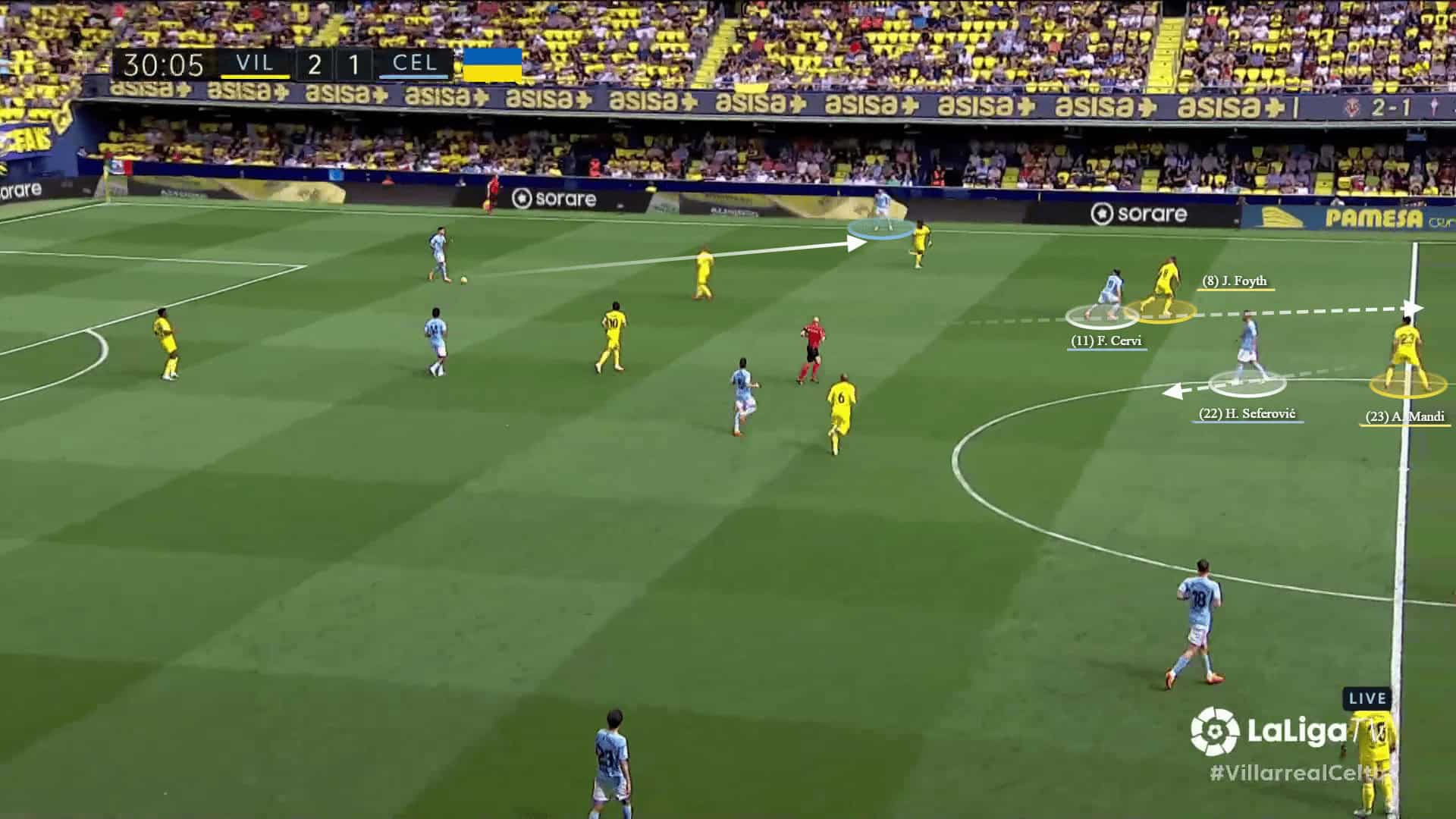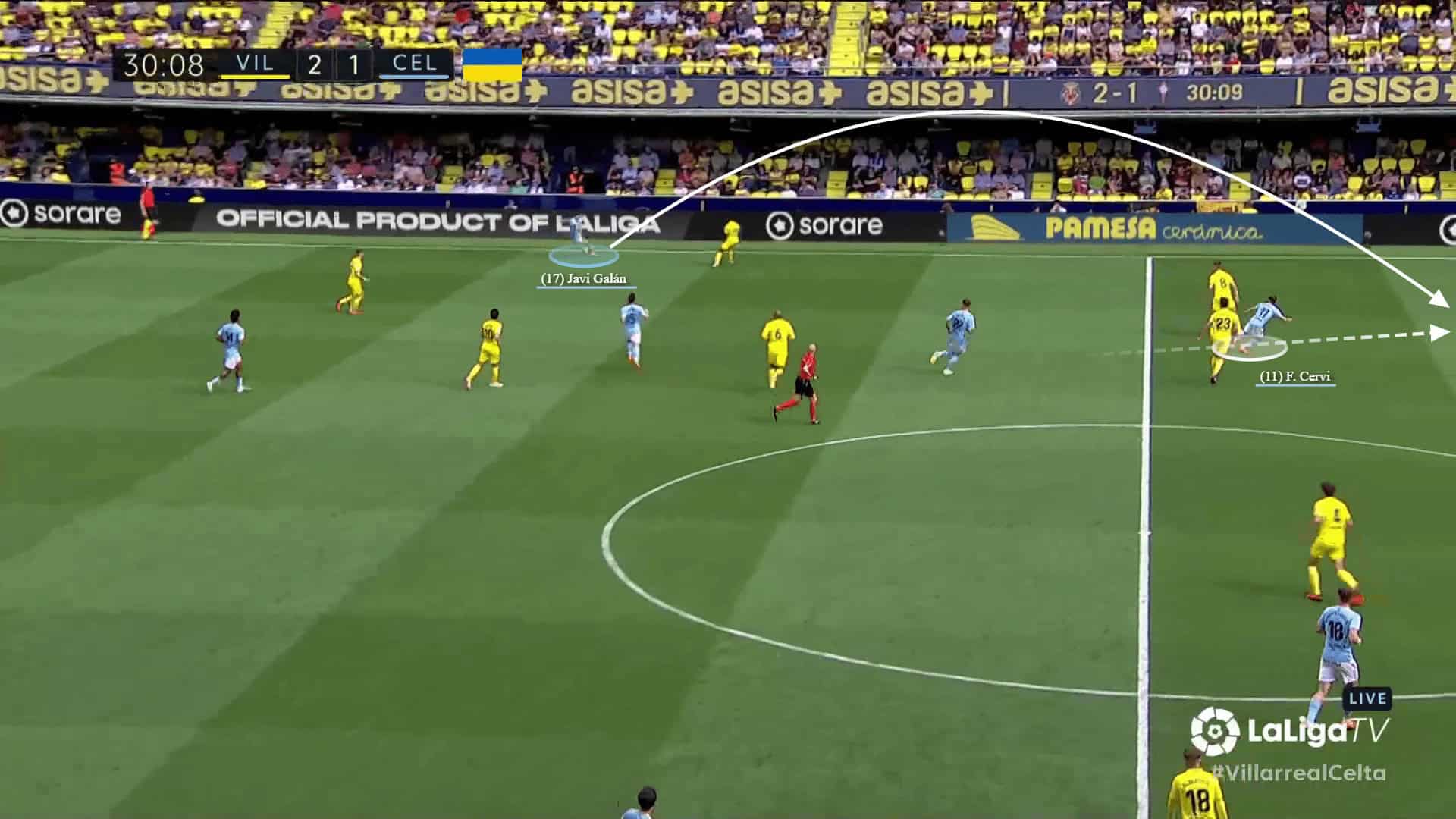 Cervi then received a through long ball into the space from the fullback, but Villarreal’s goalkeeper did well to sweep and clear the ball away.