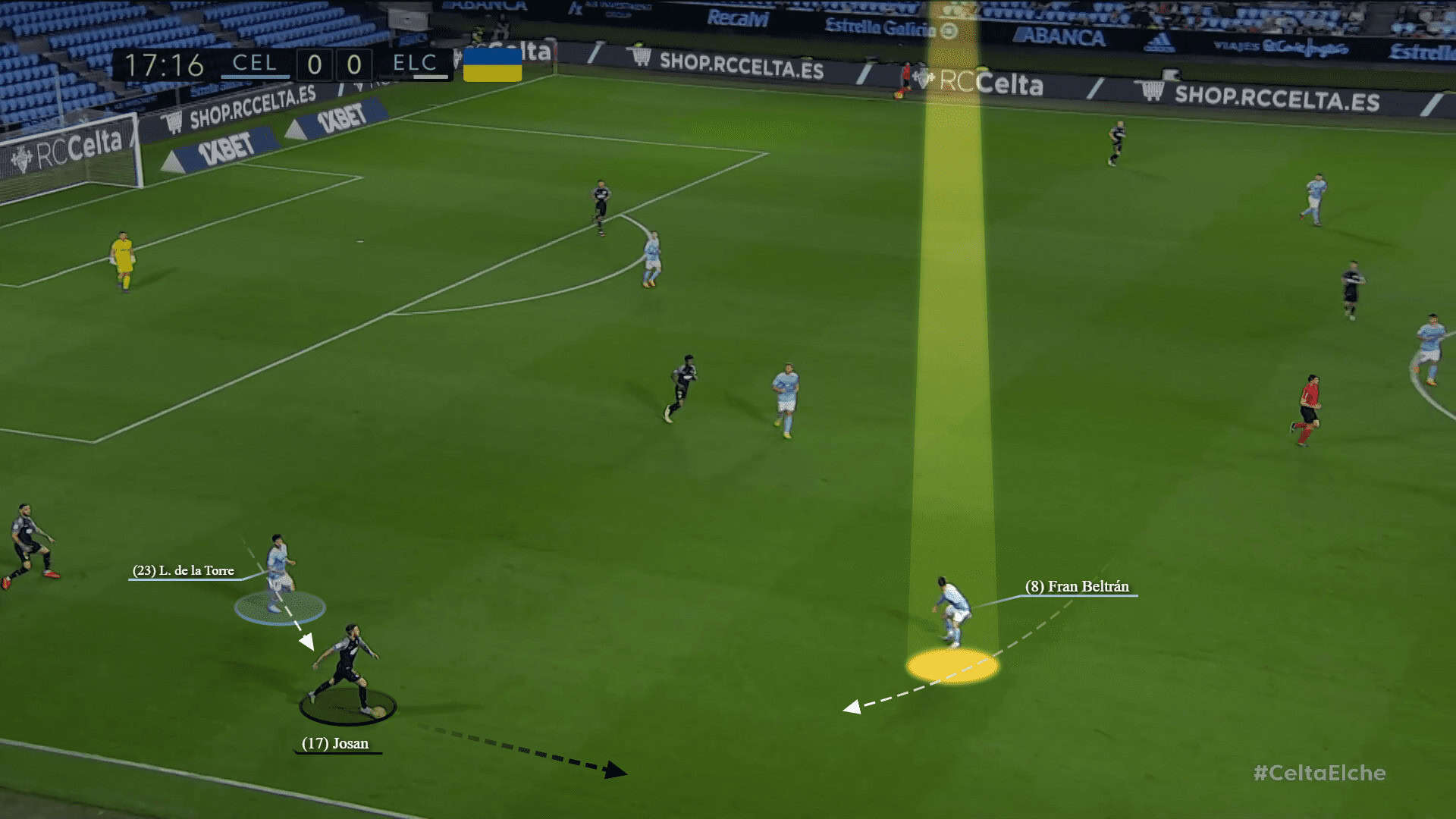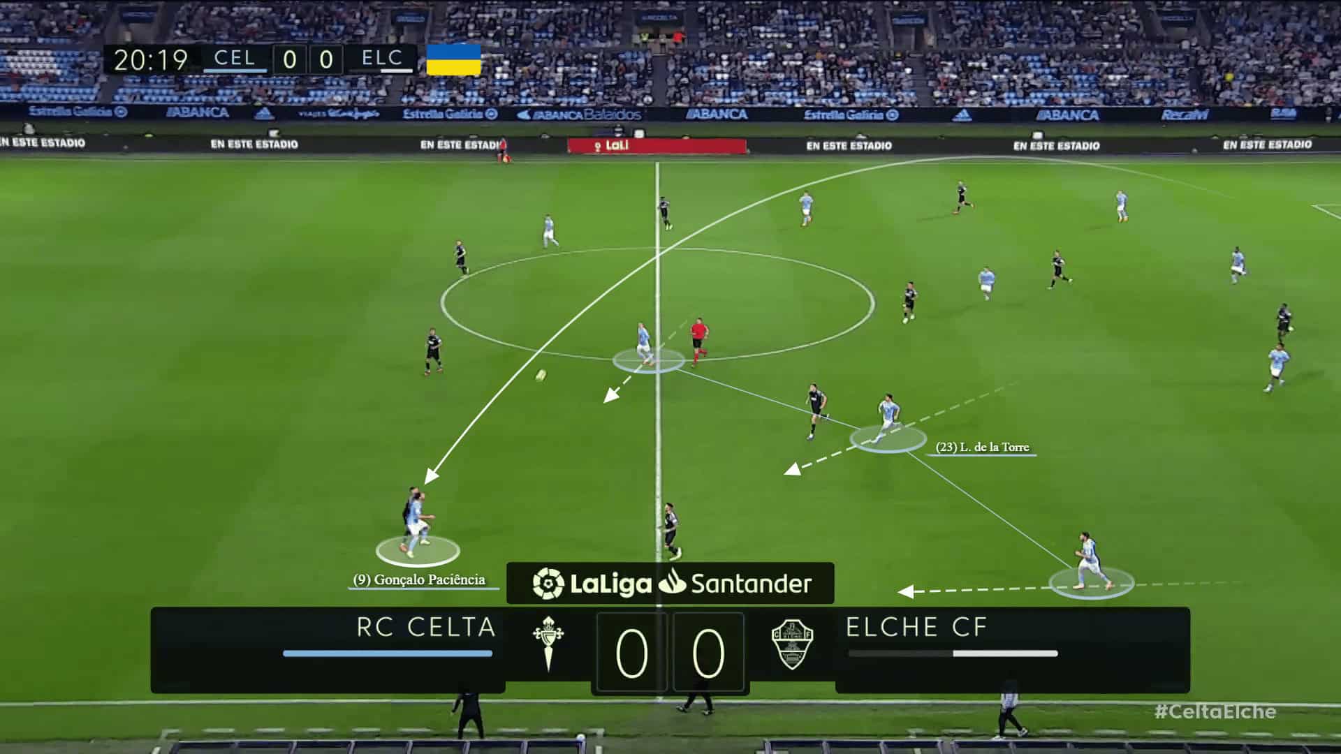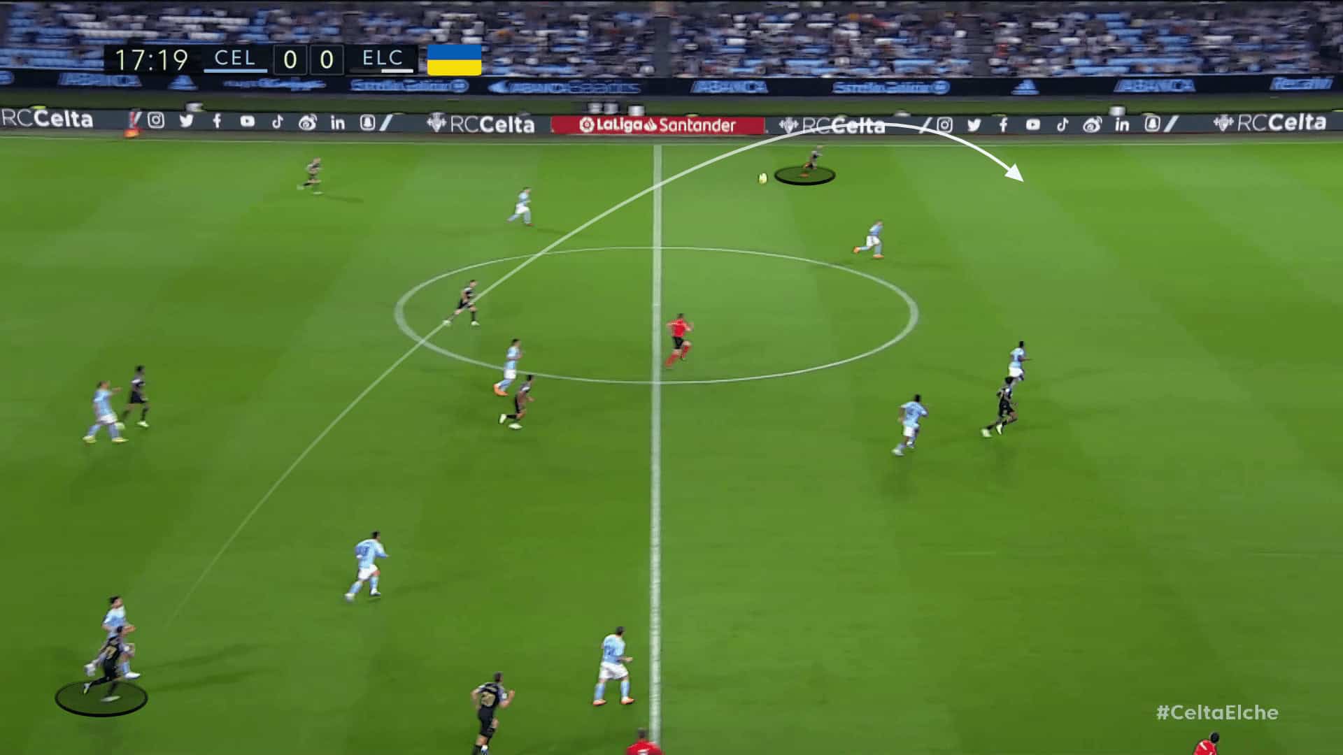 In the scene below against Elche, the goalkeeper, Iván Villar, directed the ball to the left side, into the space generated, to the attacker Paciência, while three players were ready to receive the layoff in a 3-vs-2 situation.