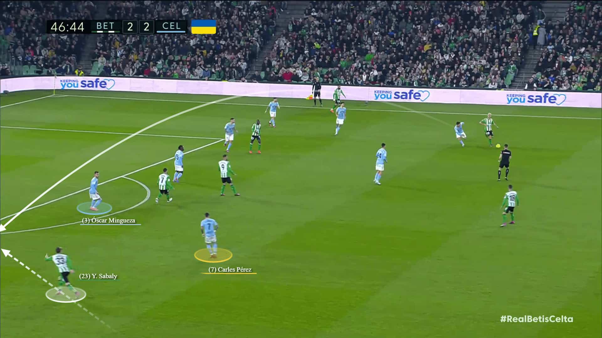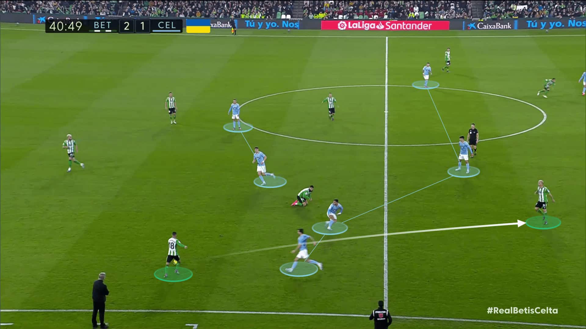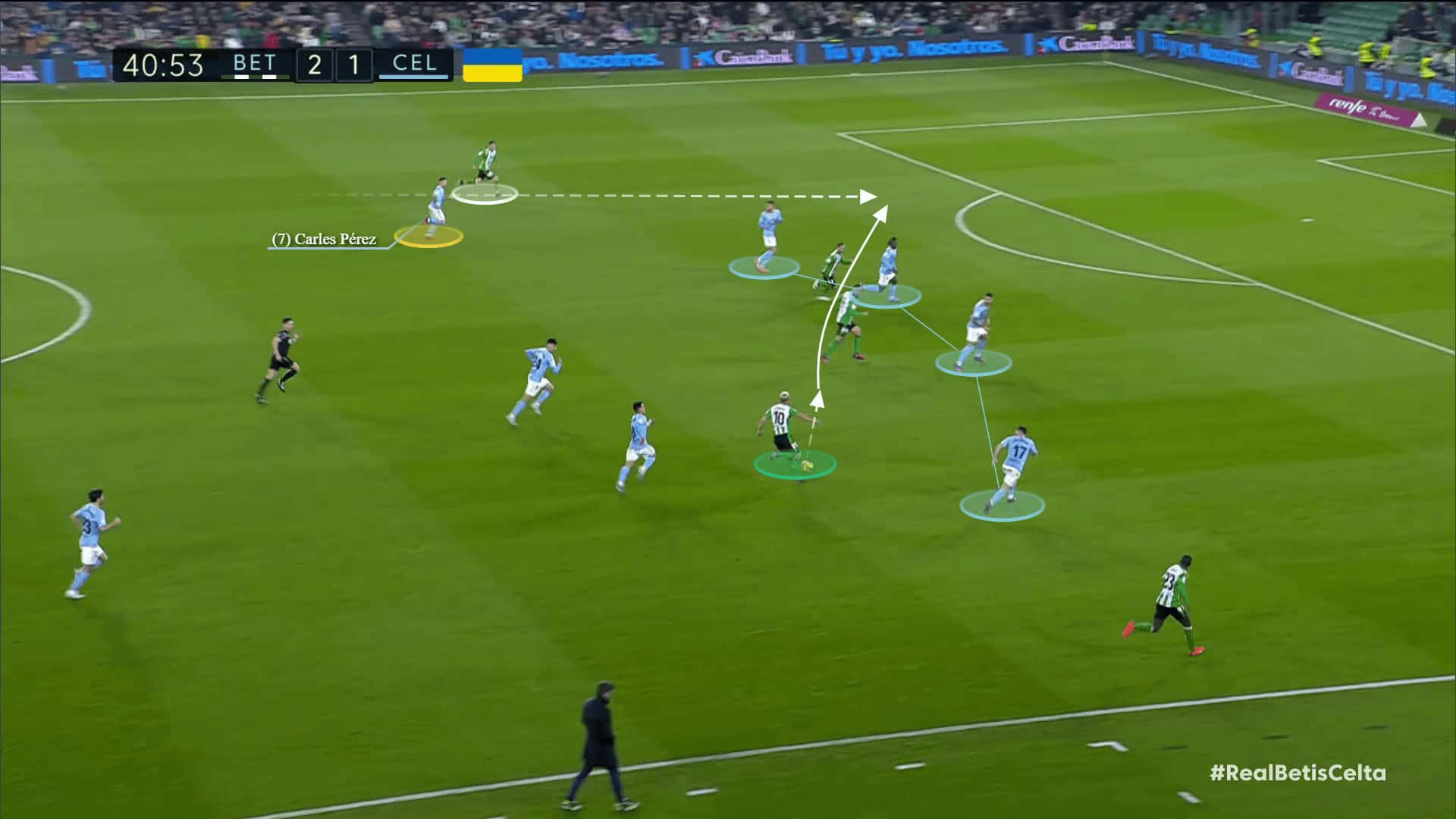 Also, against Real Betis, in their attempt to revive the press, Betis succeeded in penetrating through a gap in the defensive block of Celta Vigo, and then the midfielder who received the ball was able to progress about 15 meters without any interference and played a through pass to the overlapping left back in the blindside of ​​the backline due to bad covering from Celta Vigo’s right winger Carles Pérez, which resulted in an extremely dangerous opportunity.