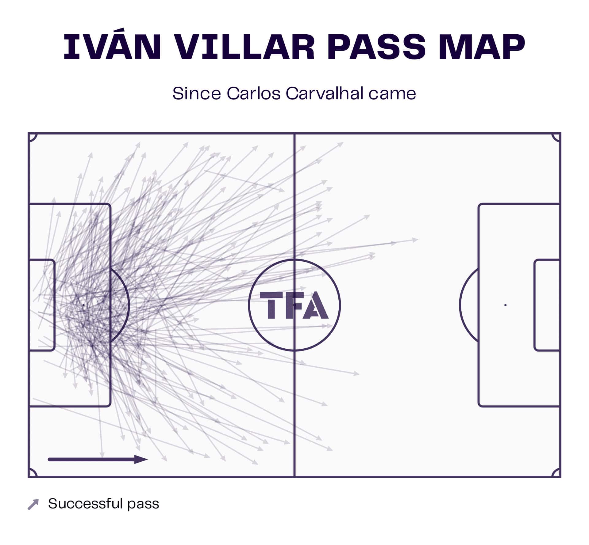 The goalkeeper Villar usually looks to play long balls there in the left half-space and flank, as shown in the graphic below.
