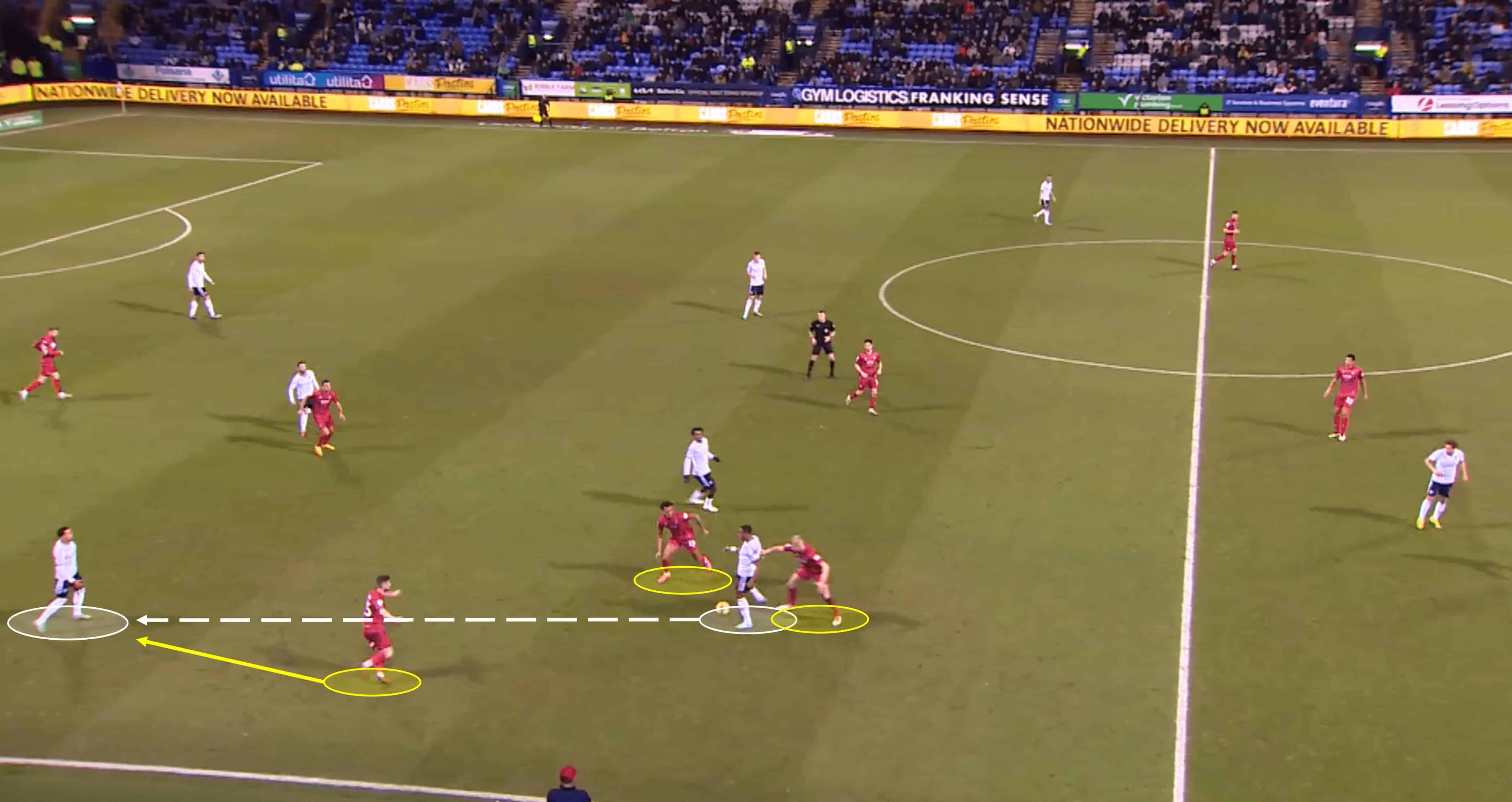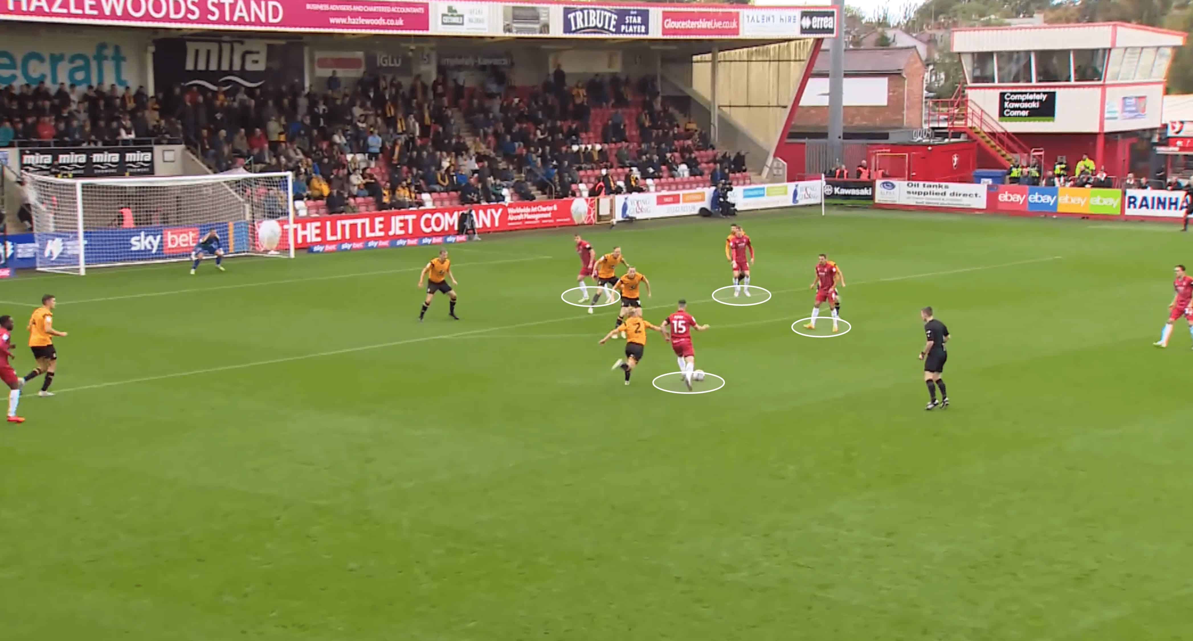 And here is an example of said counterpressing. As Bolton try to play through the thirds, they are met by several red shirts from various angles. The man on the ball in the shot is closed down by two Cheltenham players, while a third Robin applies high-intensity pressure to the next recipient in a Bolton shirt. This approach, compared to a more conservative method of having the midfielders drop and regroup, has been a breath of fresh air for Cheltenham and has had positive implications on both their defensive and attacking records under Clarke.