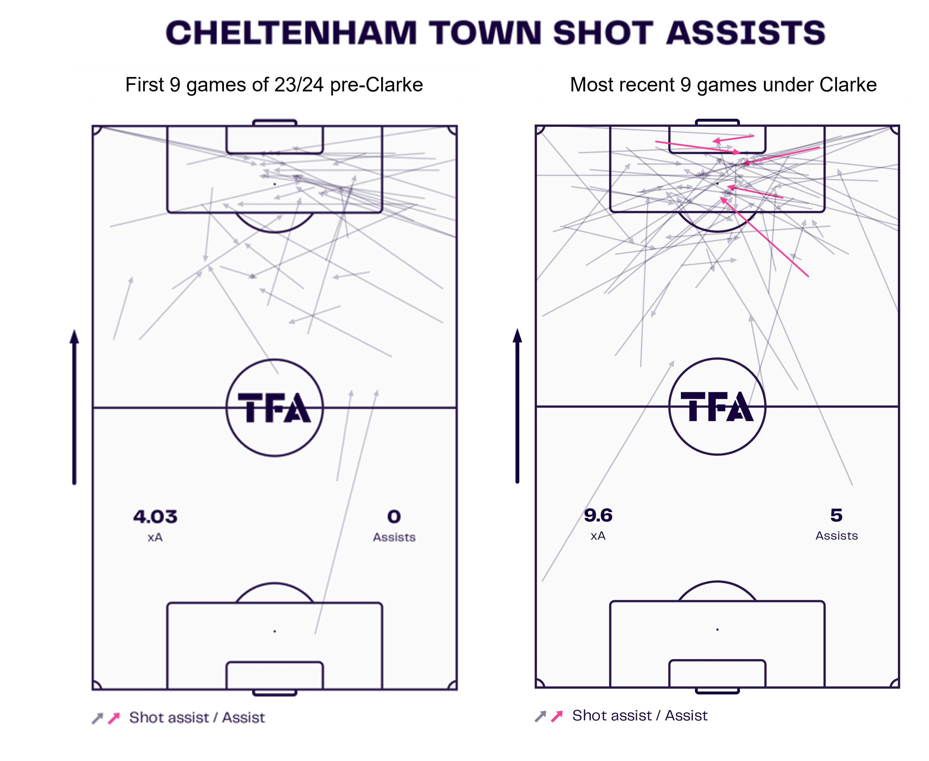 What is particularly pleasing from a Cheltenham perspective is that they’ve been able to create more chances from a wide range of locations – while the right flank remains the focus, they have displayed a higher creative frequency from the left flank and central positions under Clarke.