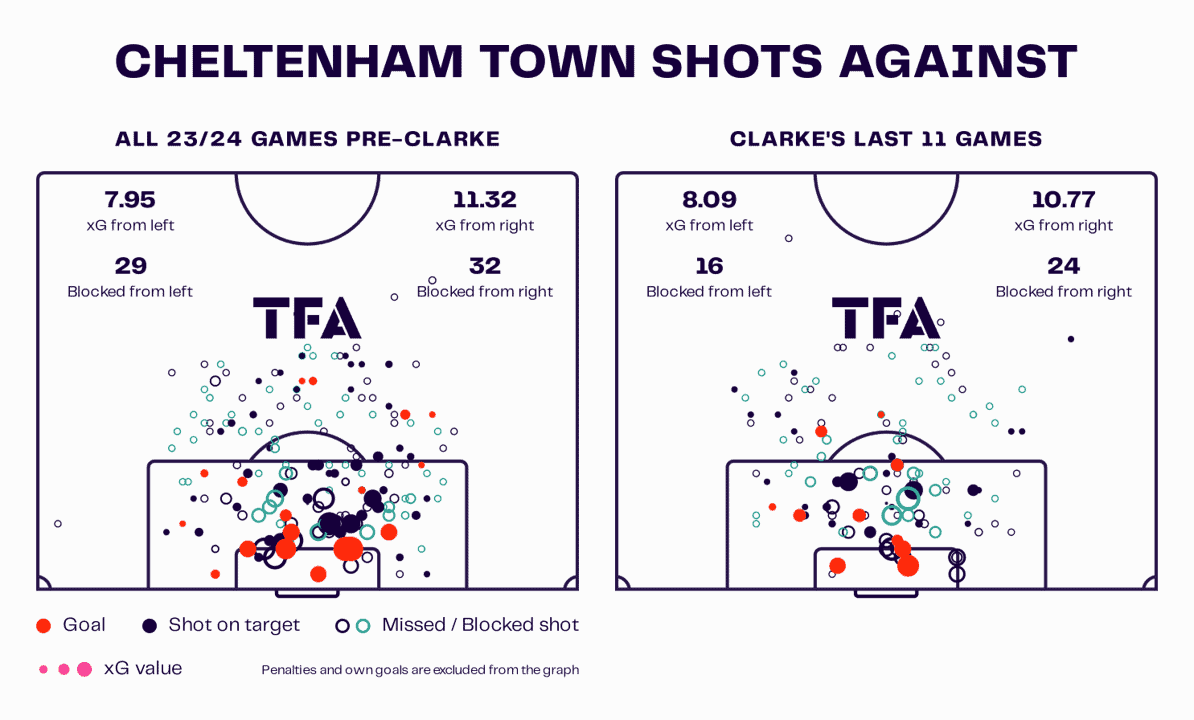 This visual provides proof and context to the improvement at the back. Here, we consider the data from Clarke’s most recent 11 games against the 11 games this season before he arrived (nine league games, two cup games). While they would still look to improve their defensive output, as we mentioned earlier, they’re performing adequately in the context of their goals for this season.