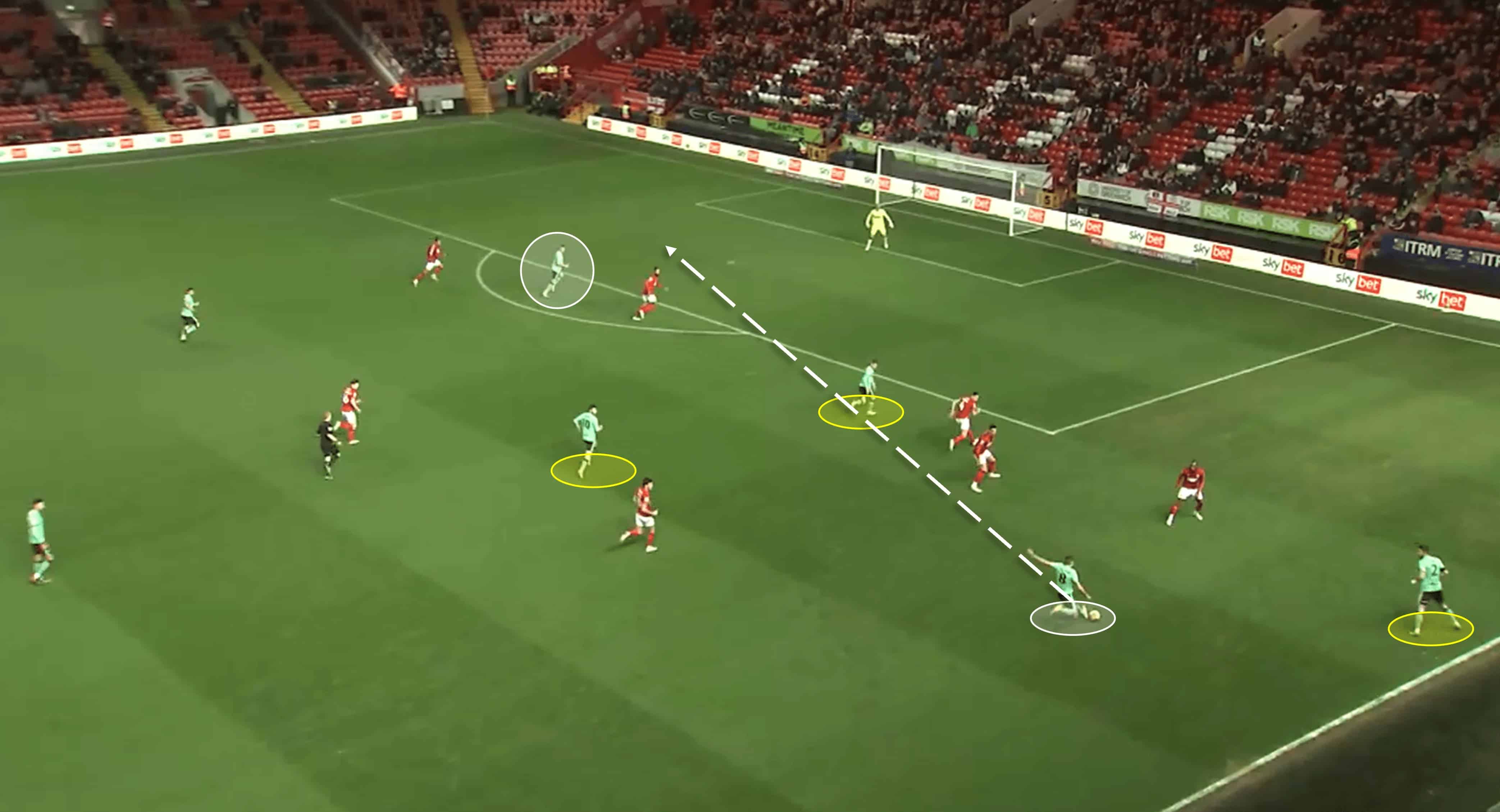 After winning the ball in a good area, they look to attack Charlton while they’re still somewhat defensively vulnerable. The man on the ball has three close passing options, two of which (right-winger and midfield option) were easy passes – the third was tricky but not impossible. However, those options were ignored as the Robins wanted to strike quickly, and this is where we see them put their aerial ability to use with an early cross, which was executed brilliantly. Choosing the cross over the easy passes is the key takeaway here in terms of tactics.