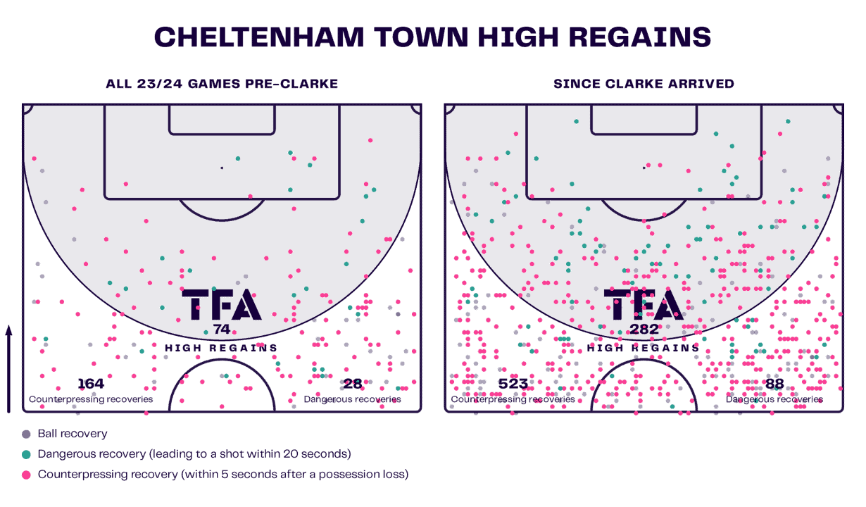 For context, the numbers above are not from an even number of games – 11 games in the pre-Clarke era compared to 21 games in the Clarke era. Regardless, the data still indicates a huge improvement, especially in counterpressing. Cheltenham like to capitalise on opposition mistakes and vulnerabilities and have, in fact, created numerous goalscoring chances as a result. Their record of 523 counterpressing recoveries in 21 games compared to 164 in 11 games is a significant increase. They also post similar increases for high regains and dangerous recoveries – Clarke’s team have a strong talent for this and could be key in keeping them up.