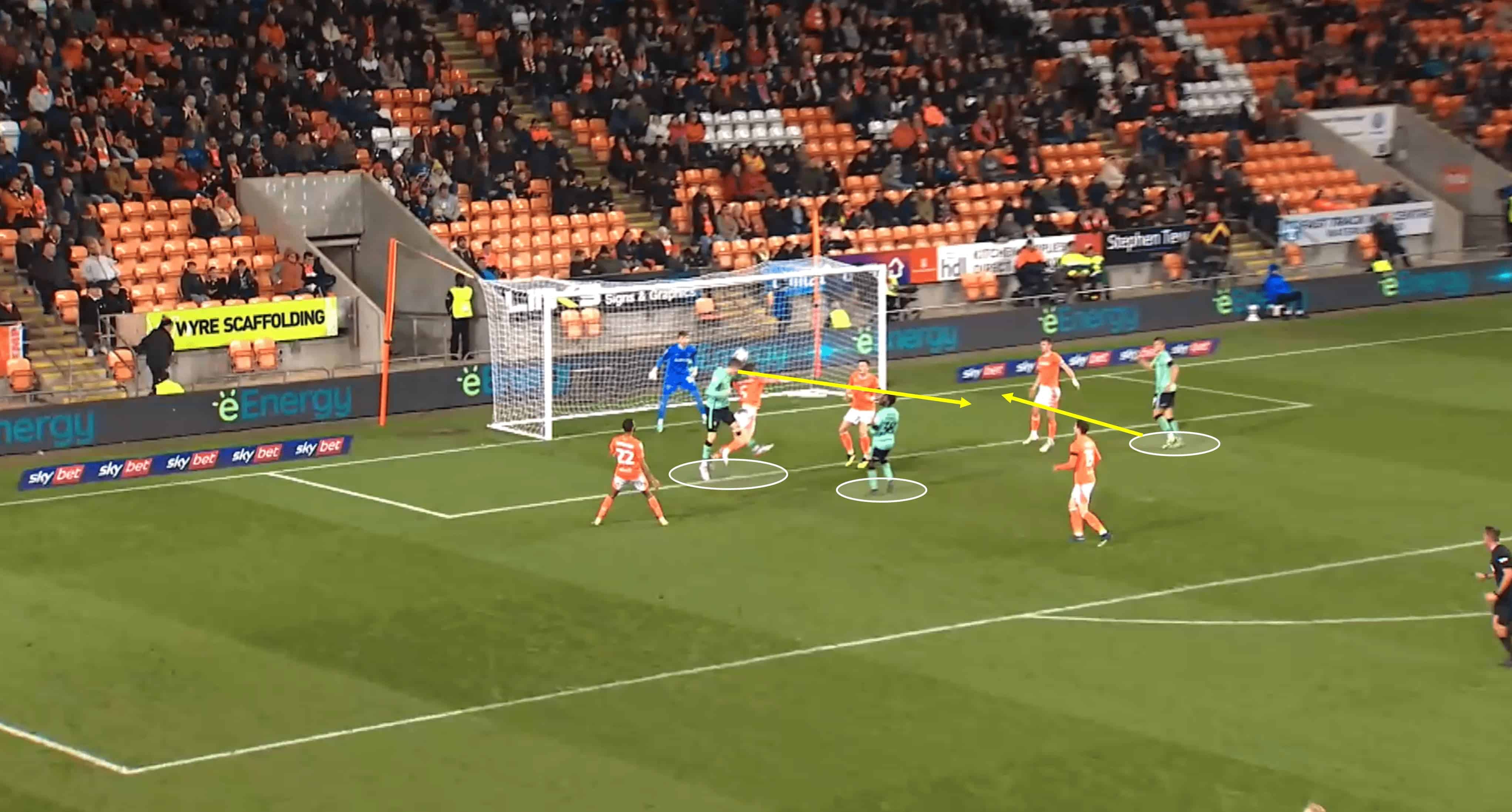 Given Cheltenham’s circumstances and, to be frank, squad quality, there was never going to be a tactical overhaul from Clarke – he wasn’t going to come in and transform them into a possession-based team; the opposite – his side have the lowest average possession percentage in League One (42%). This comes with limitations in terms of a firm approach in attack – they have to be versatile and attack according to the situation at hand, though they do try and incorporate their strengths, which is what you see in the example above.