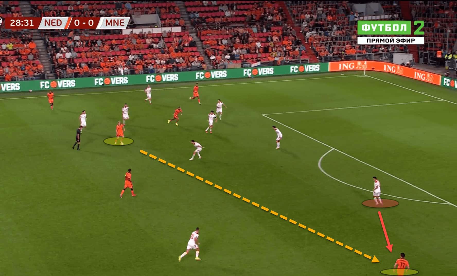 In this example, the Netherlands have created a wide overload on the left flank. The opposition have pushed their defensive block across in order to ensure that they have enough bodies to defend against the overload, which in turn leaves a wide player in a 1v1 situation with the defending fullback on his side.