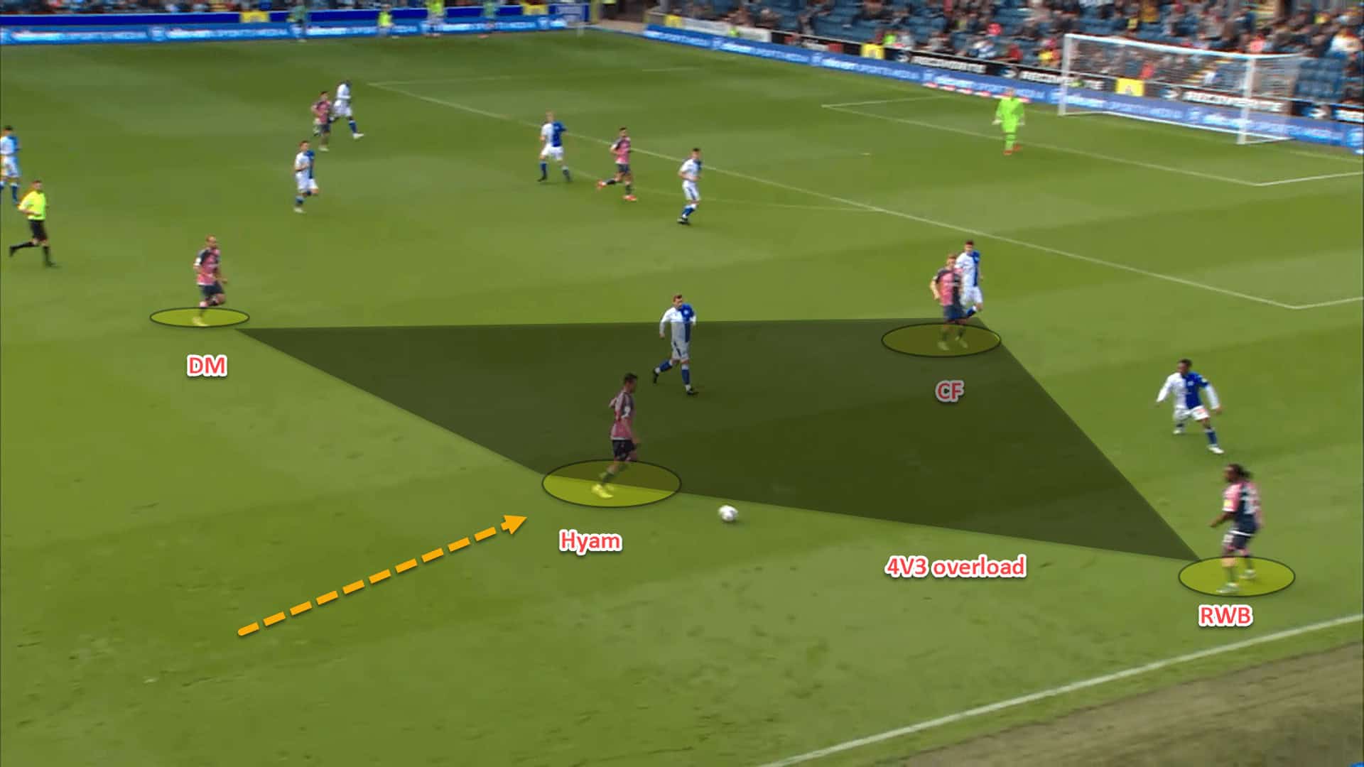 When he advances through the opposition’s first line, and potentially their second defensive line, Hyam stays forward and creates a wide overload.