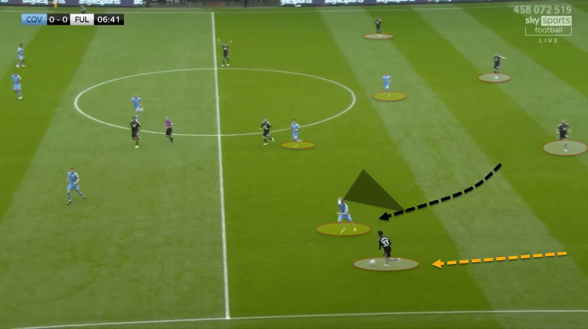 However, this opens up a gap through the centre of Fulham’s medium-level block that Coventry can take advantage of by playing to the feet of the dropped centre-forward. The striker holds up the ball, allows the defender to close him down from behind, quickly turns him and plays to the left-wingback in a dangerous position.