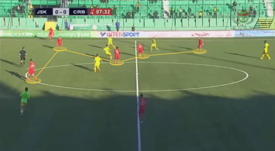 The idea behind everything is that wherever the ball moves, the midfielders go close with their peers who will want to move to that side to create a space where they can receive, but the Belouizdad players are extremely attentive to follow them in their marking so they can’t create these kinds of passing options. There, the winger of that side is already marking very tightly the rival full-back.