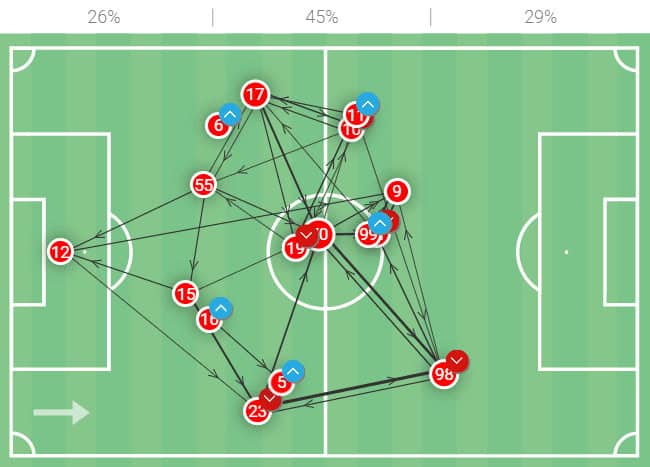 What is incredibly noticeable is that, for the most part, the passing links between the players are quite weak. The strongest were from the right-back to Zanimacchia and one of the pivot players to Zanimacchia.