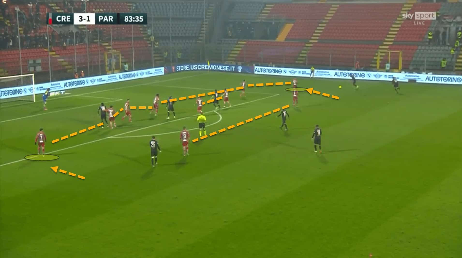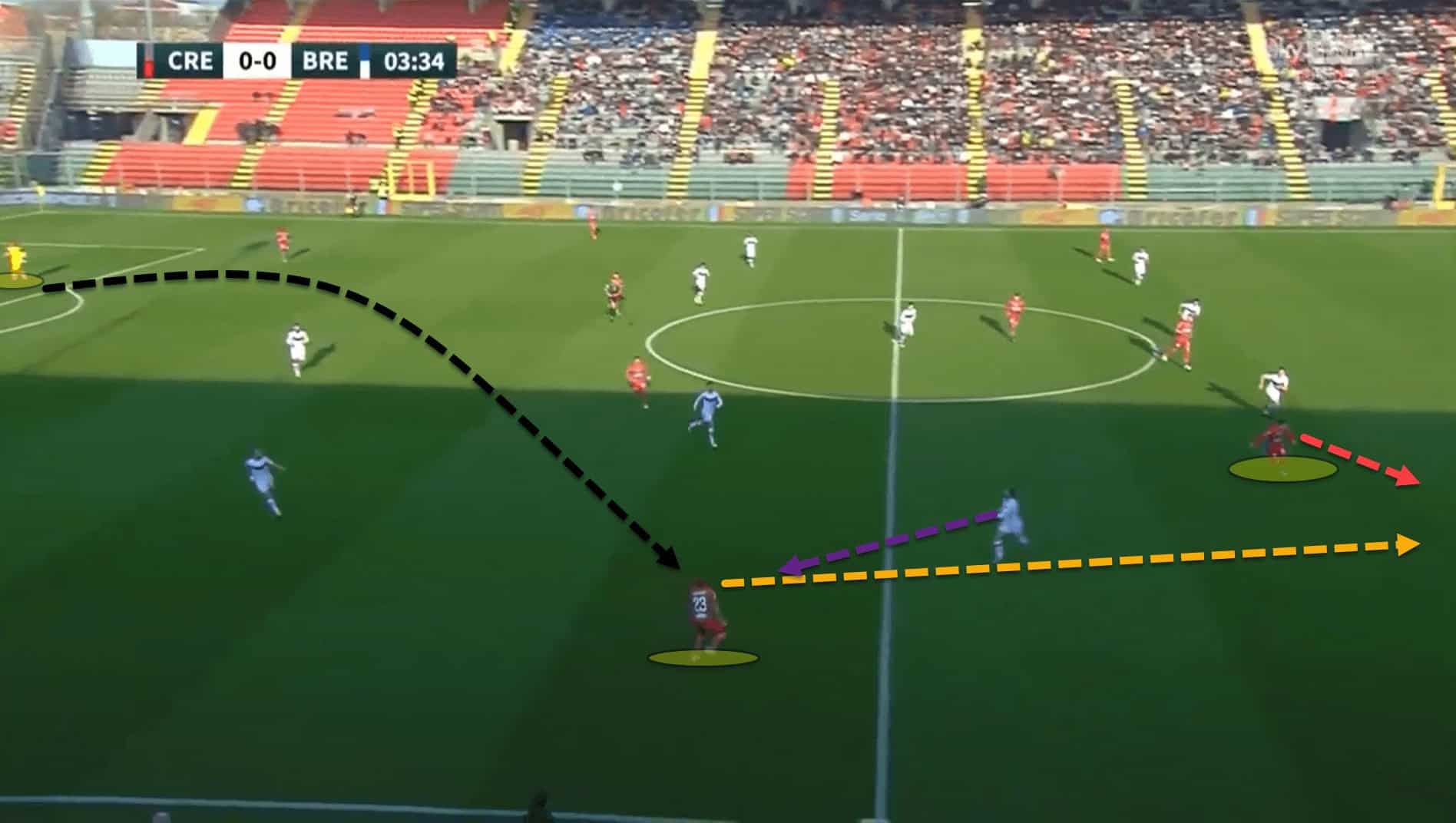 The right-back nodded it into his path and then Cremonese were allowed to attack in a dangerous area of the pitch. This all came from merely some good positioning against the opponent’s block and has proven to be a legitimate way for the Serie B leaders to bypass pressure and advance up the pitch quickly.