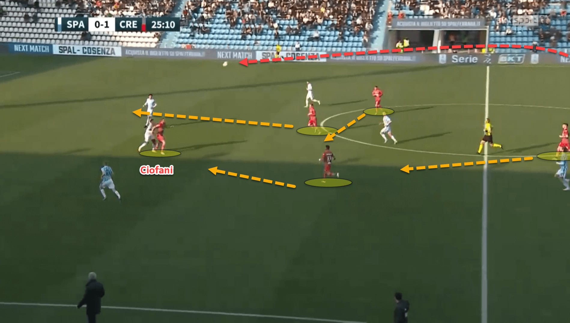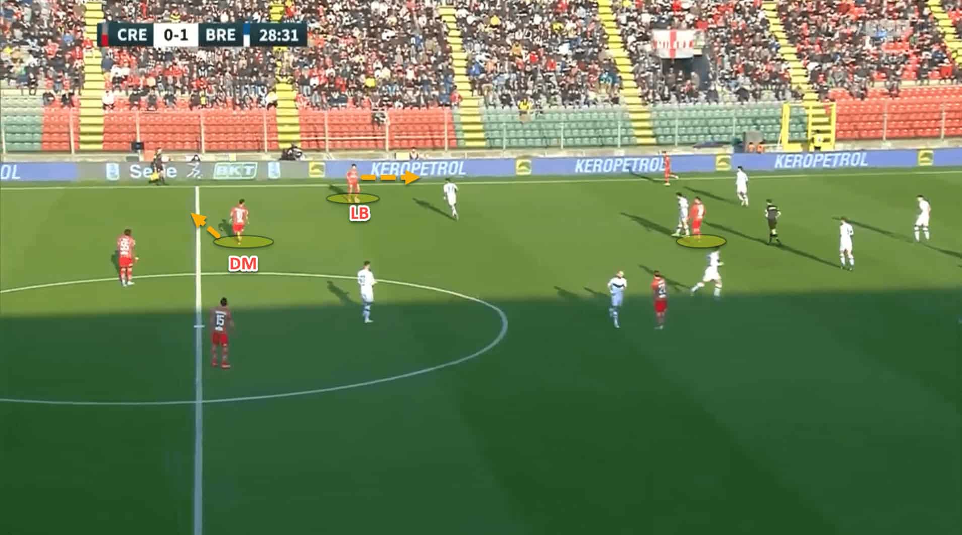 By Cremonese pinning the fullbacks down alongside the centre-backs, it allows them to play the ball out to the fullbacks while playing out. This is a constant tactical component of the Grigiorossi’s play.