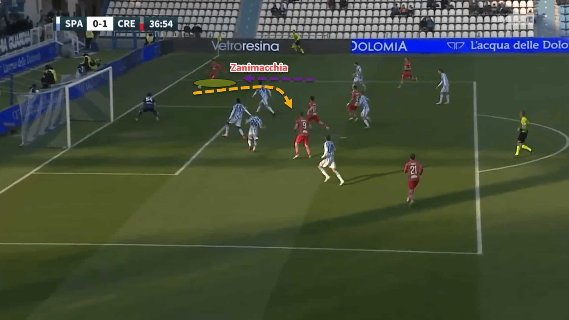 Linking up with the right-back during a wide overload, Zanimacchia is constantly able to get into dangerous positions to cross the ball into the box.