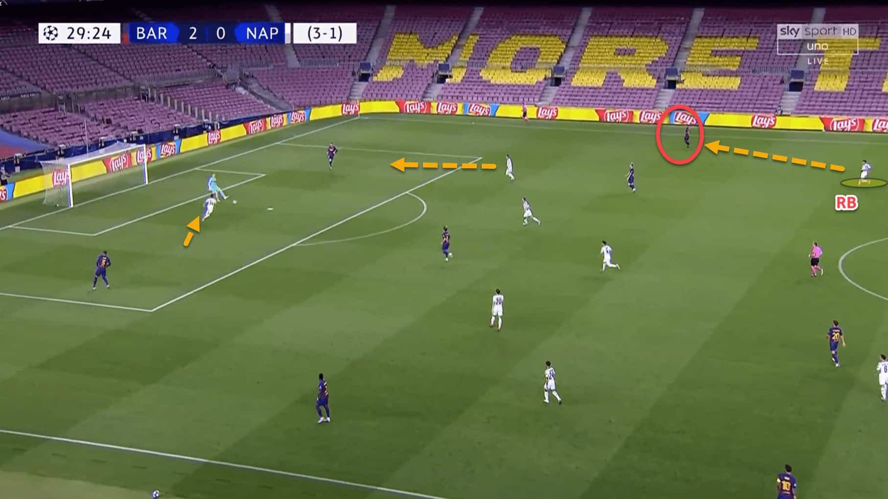 For instance, here, Napoli are pressing very narrowly against Barcelona in the UEFA Champions League back in 2020. This has caused La Blaugrana’s left-back to be free to receive on the far side should the players switch the play.