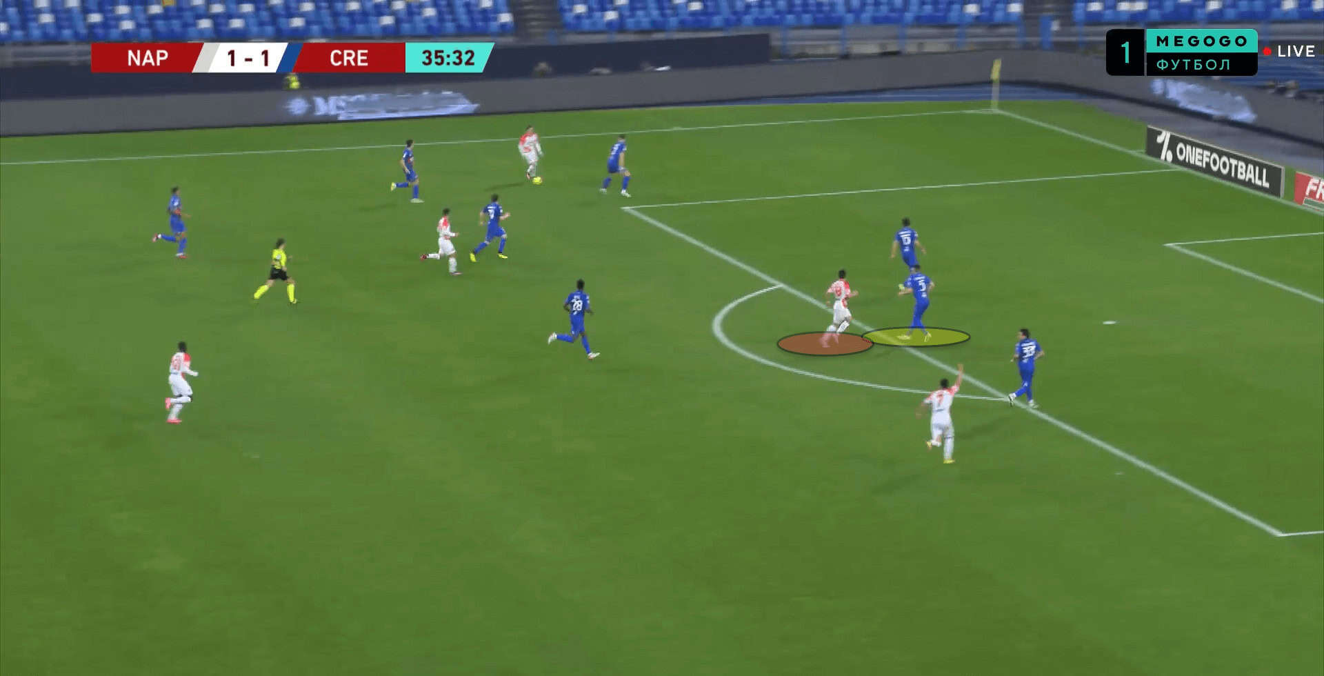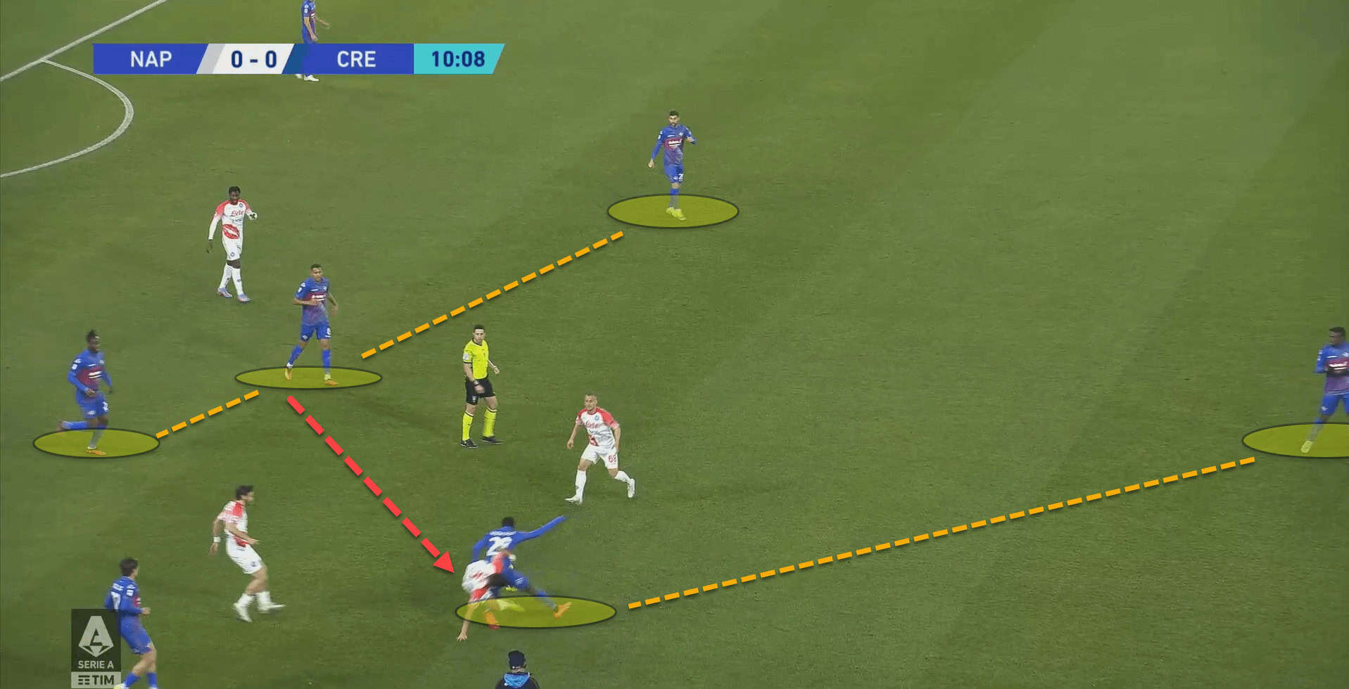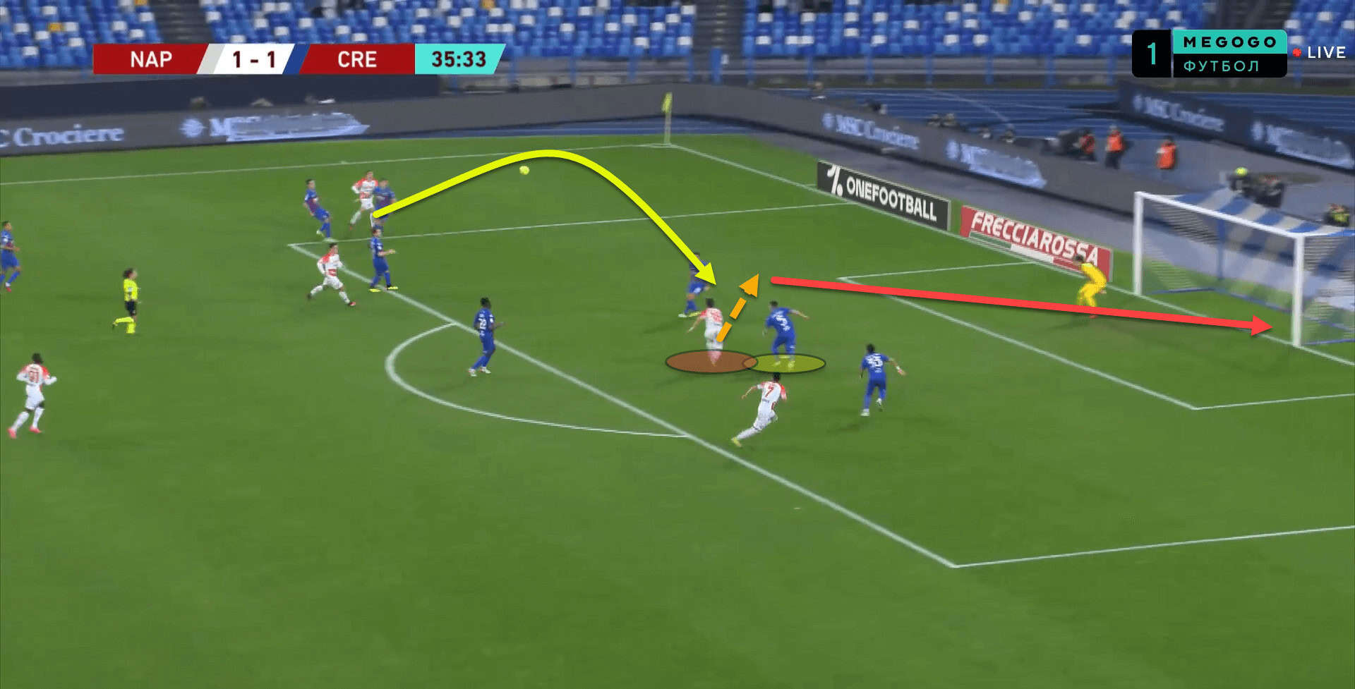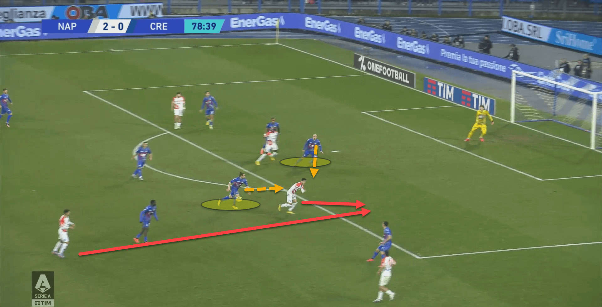 As a result of his deficient initial stance, the Napoli frontman makes a run on the inside and the Cremonese centre-back can’t get anywhere near him because his body orientation was suboptimal to begin with.