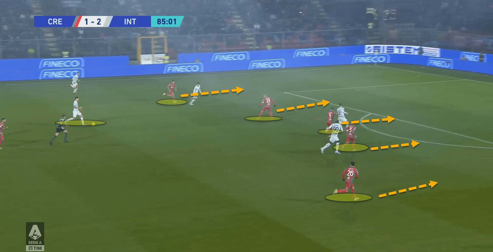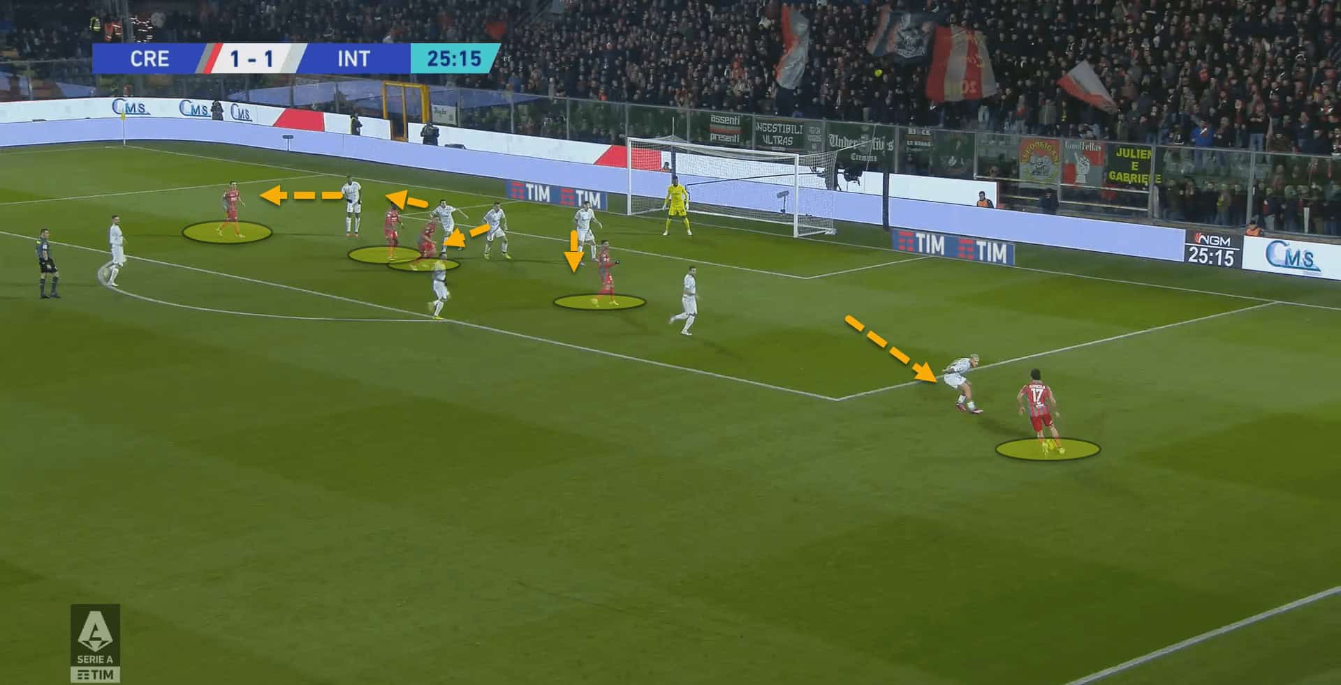 In the previous image, Cremonese’s defenders are dropping off and dropping off but not one leaves the defensive line to apply pressure to the most dangerous player – the one with the ball.