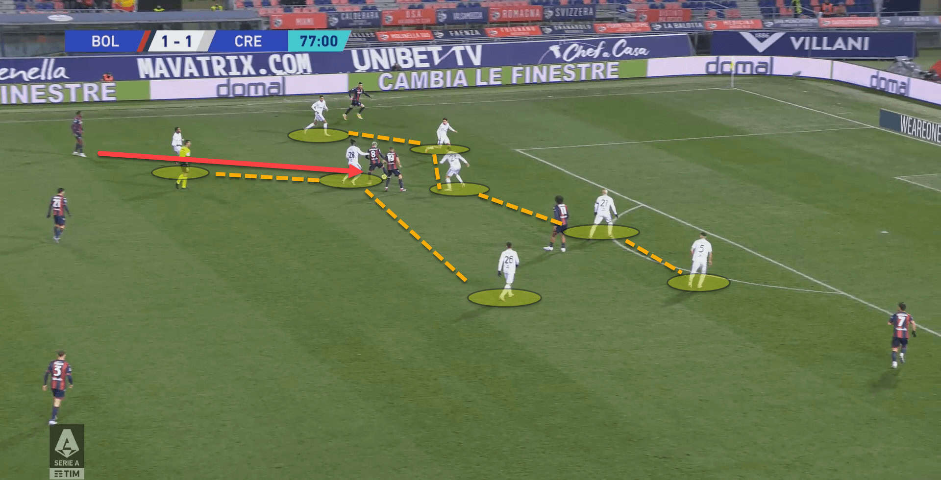 In this example against Bologna from a recent 1-1 draw, Cremonese had a plus-one against the home team’s back four, which could also be labelled as numerical superiority.