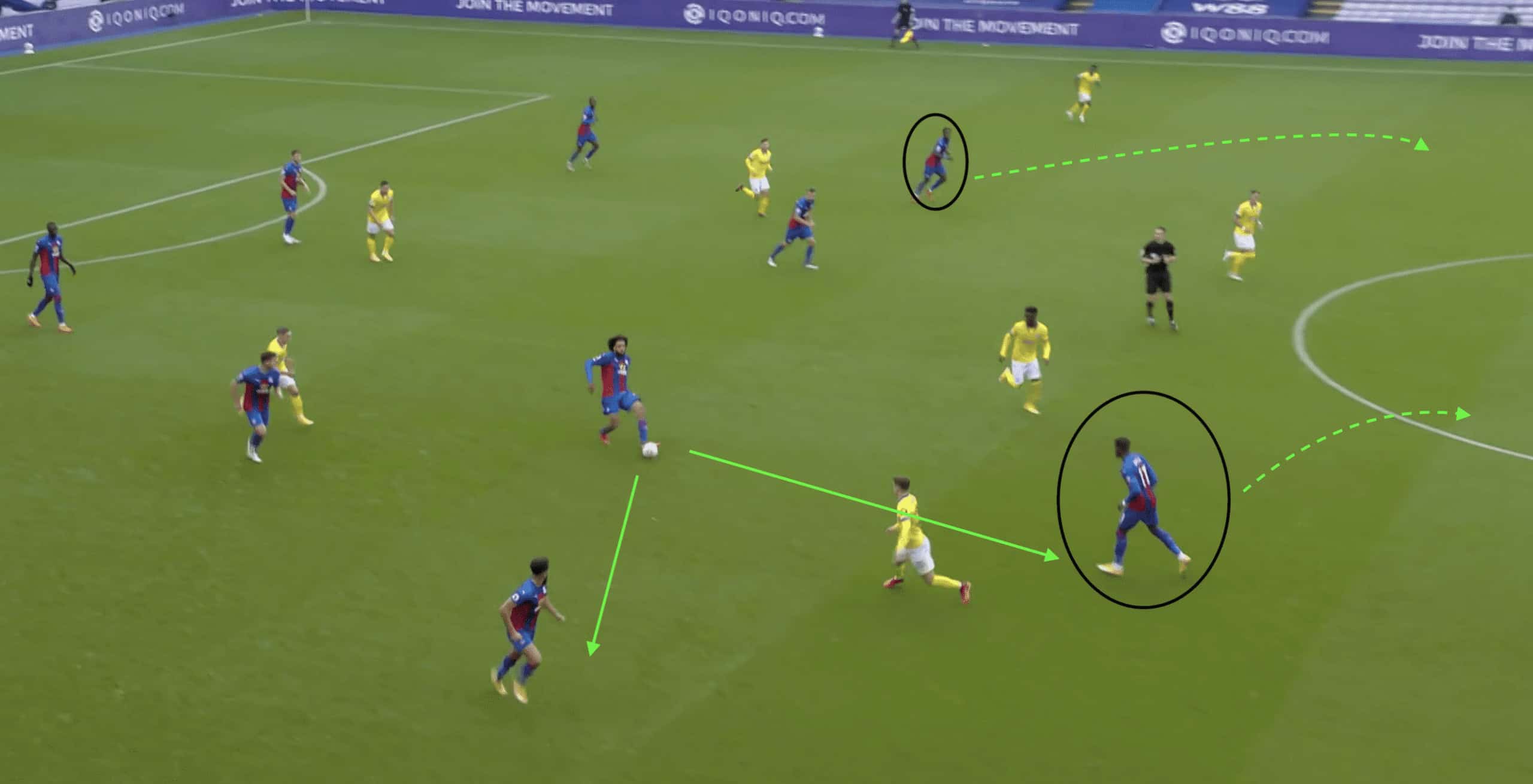 The analysis below shows an example of the pivot player distributing the ball to the attack as Crystal Palace look to break on the counter. This example shows how Zaha likes to show up in areas of the pitch in order to command the ball and drive forward. Simultaneously, Townsend is calling for the ball to take it up the wing, while Schlupp is on the opposite wing making a run forward. While this is happening, the two midfielders will stay stagnant and help cover the back four.