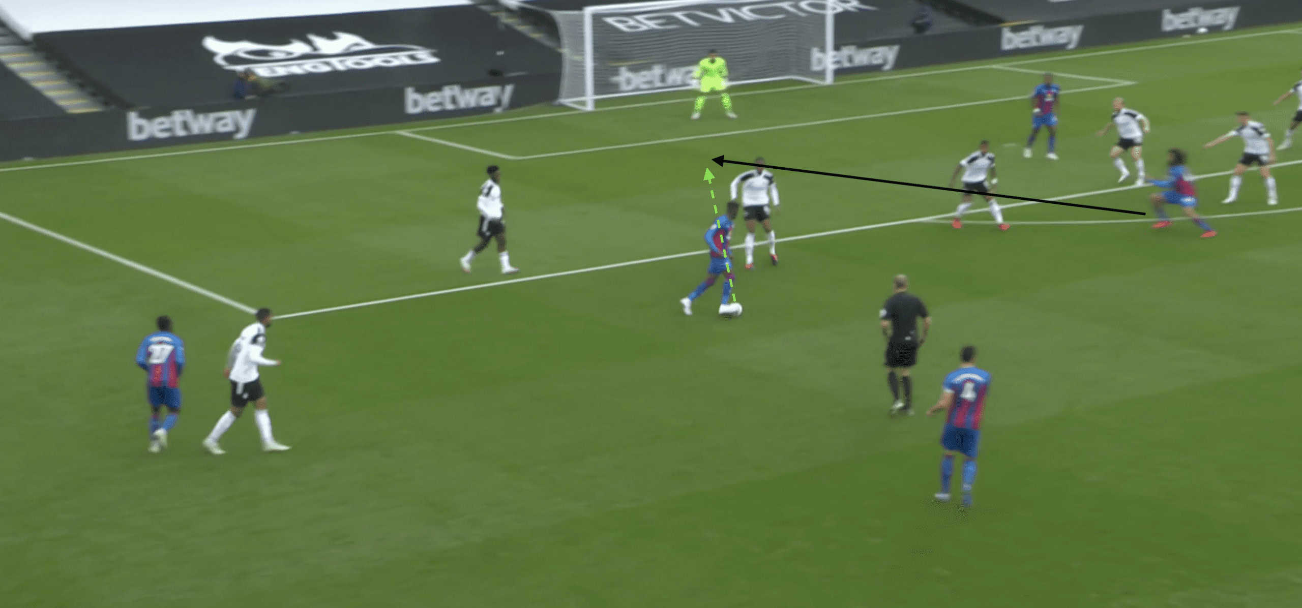 By getting Zaha on the ball, he is far more dangerous in both goal scoring and goal creating. In the example below, Zaha gets on the ball and is able to provide a fantastic reverse ball assist for Palace to score their first goal of the match against Fulham. These kinds of passes are what is the difference for Palace who does not score many goals. They rely on getting ahead then letting their defensive block control the match. This level of skill from Zaha is again why the Eagles are so dependent on him.