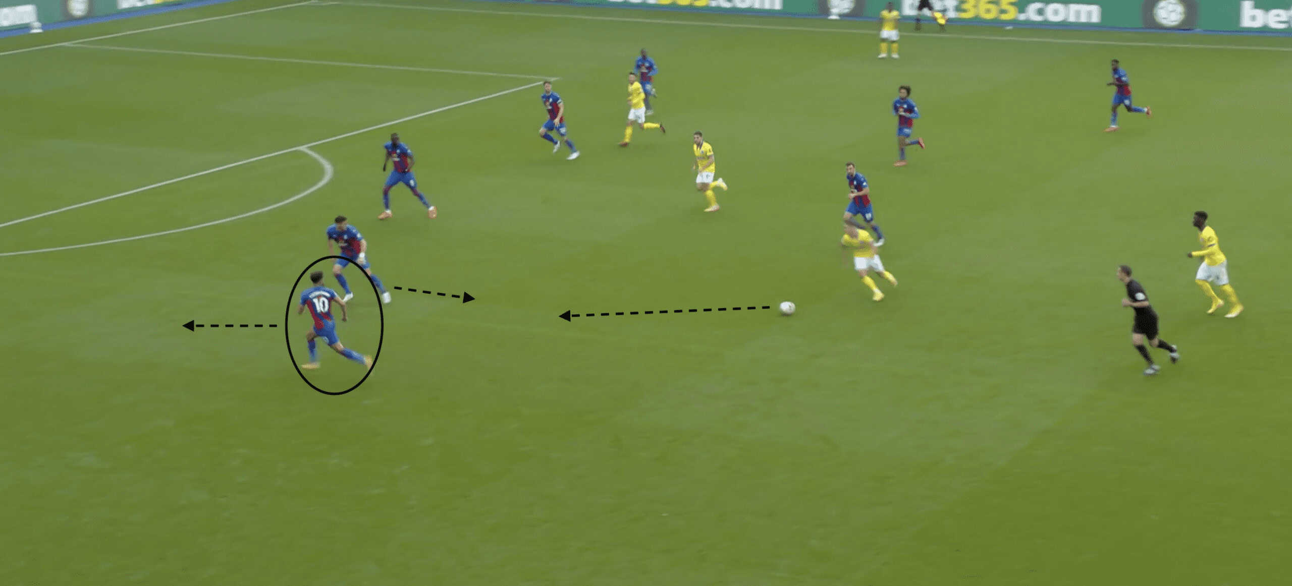 The analysis below shows an example of the heavy yards the outside midfielders must put in so Palace can keep their shape. In this instance, Solly March has the ball and is looking towards his left side. With Palace potentially outnumbered, Townsend fulfills his tactical duties by tracking back. As you can see, the Eagles still keep the back four shape that serves them so well.