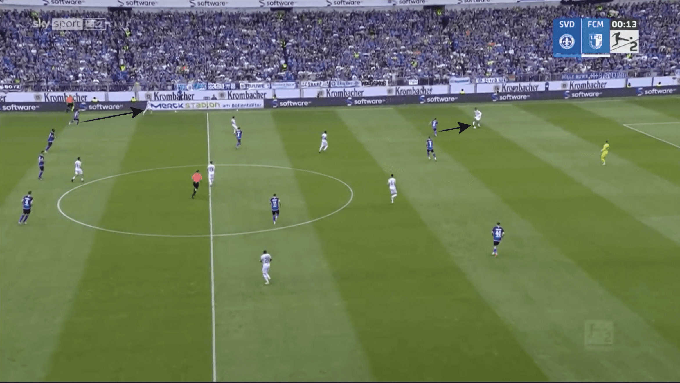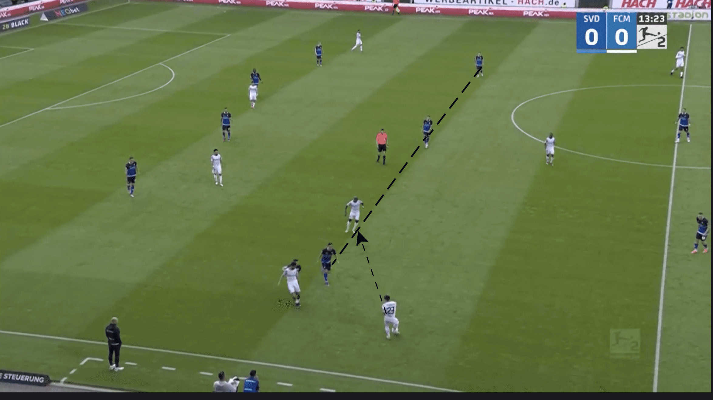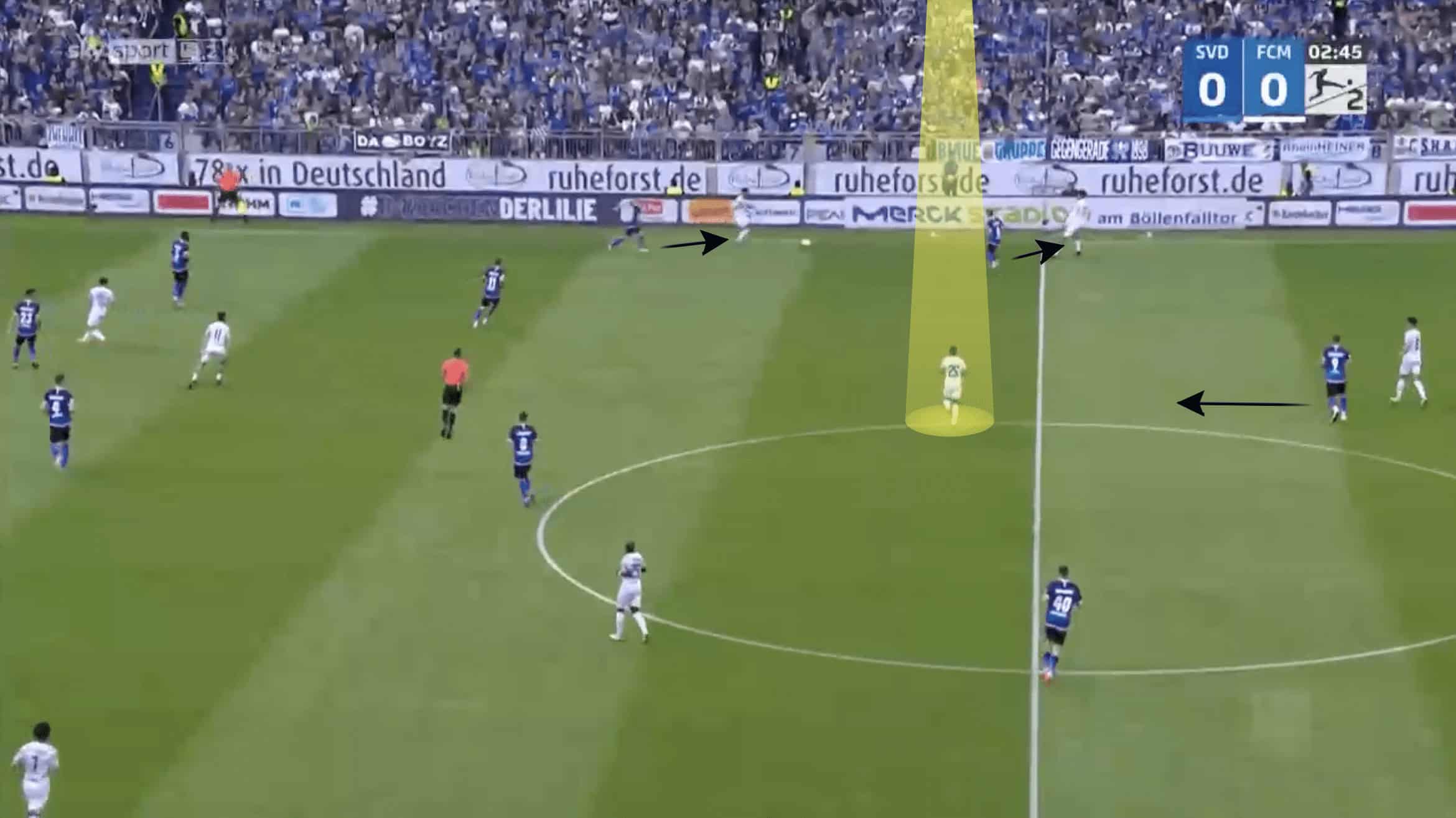 As can be seen in the example below, Darmstadt’s two midfielders in the 5-2-3 move towards the wide areas in order to cover the Magdeburg players in this area.
