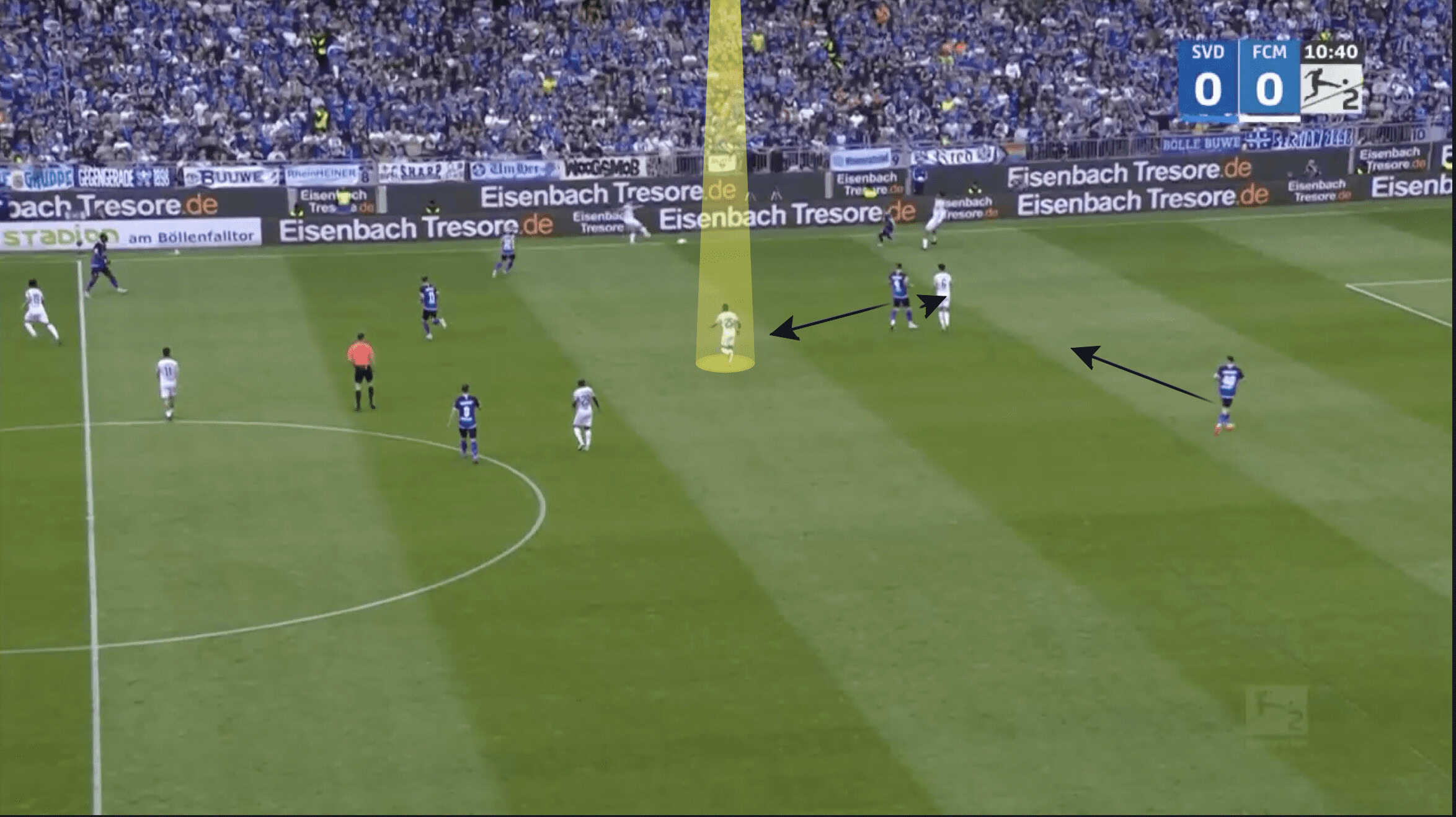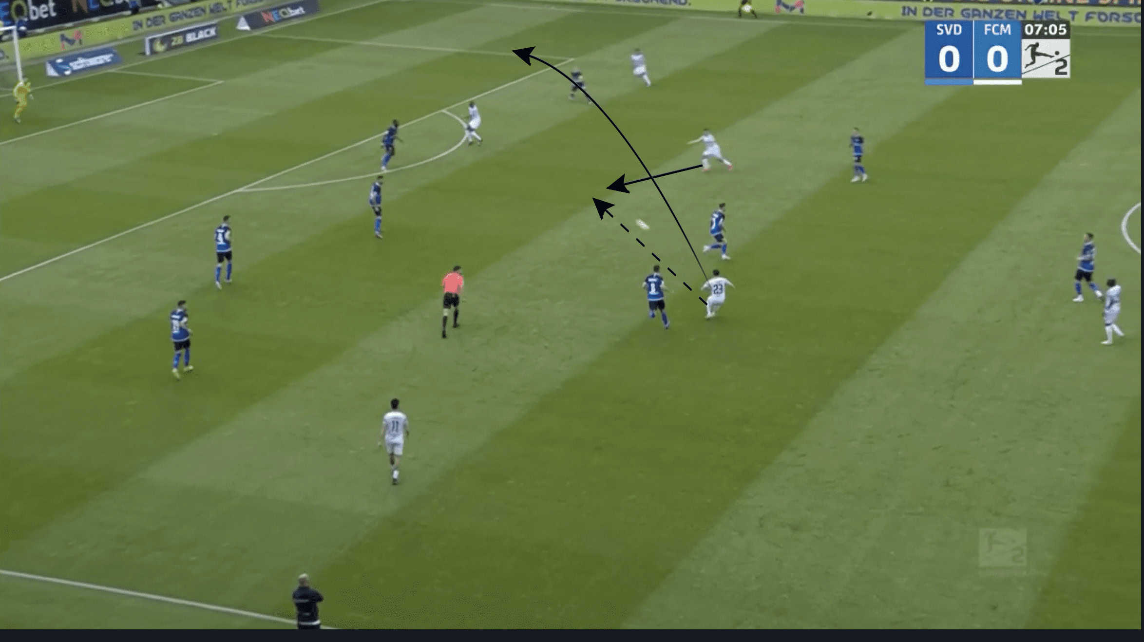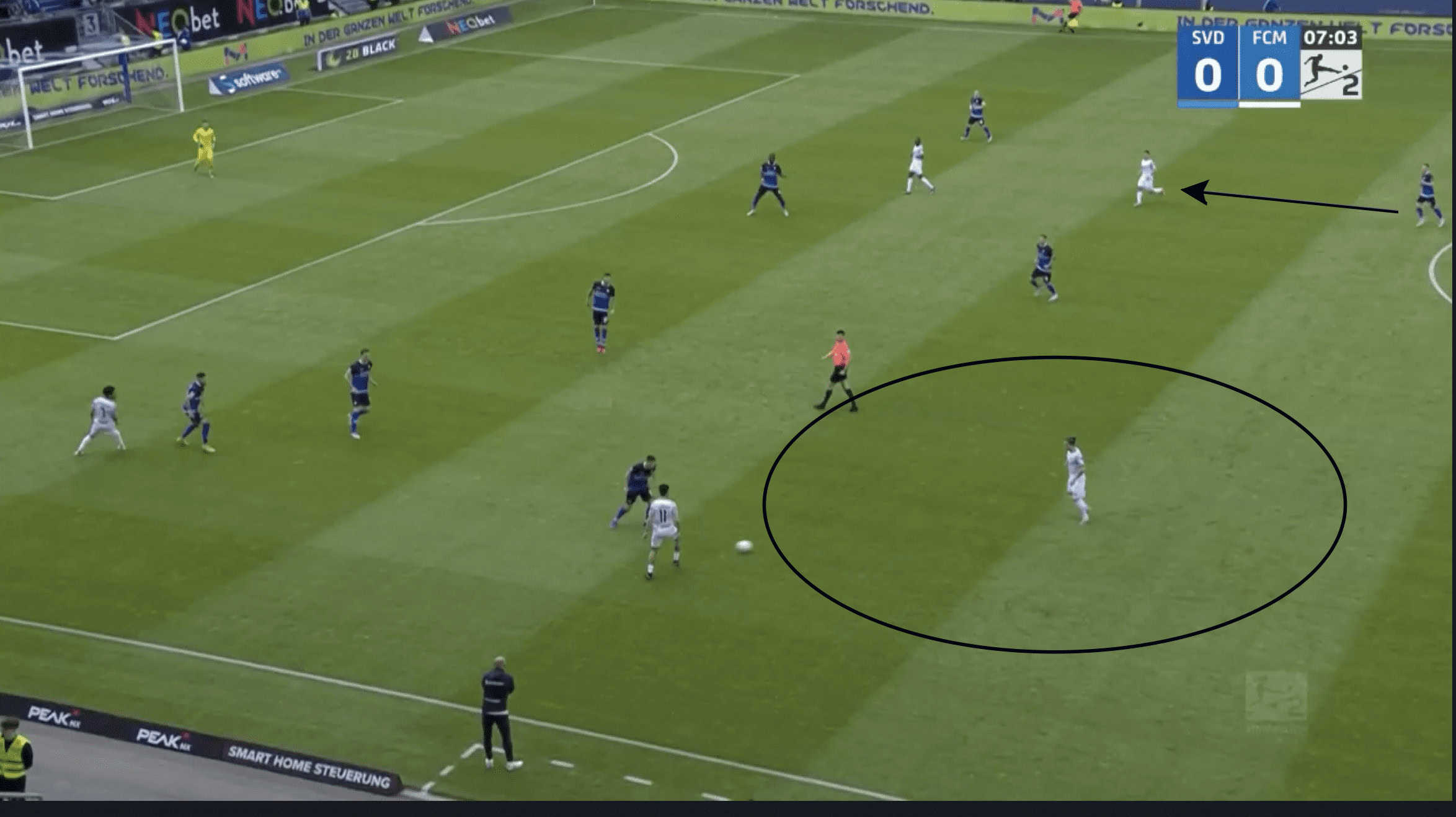 As can be seen in the example below, Darmstadt’s two midfielders in the 5-2-3 move towards the wide areas in order to cover the Magdeburg players in this area.