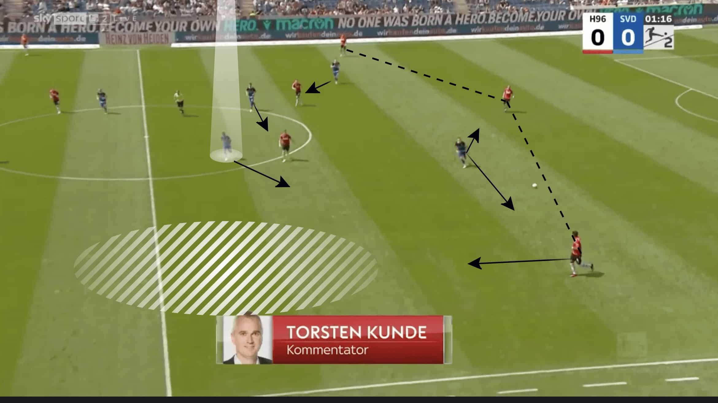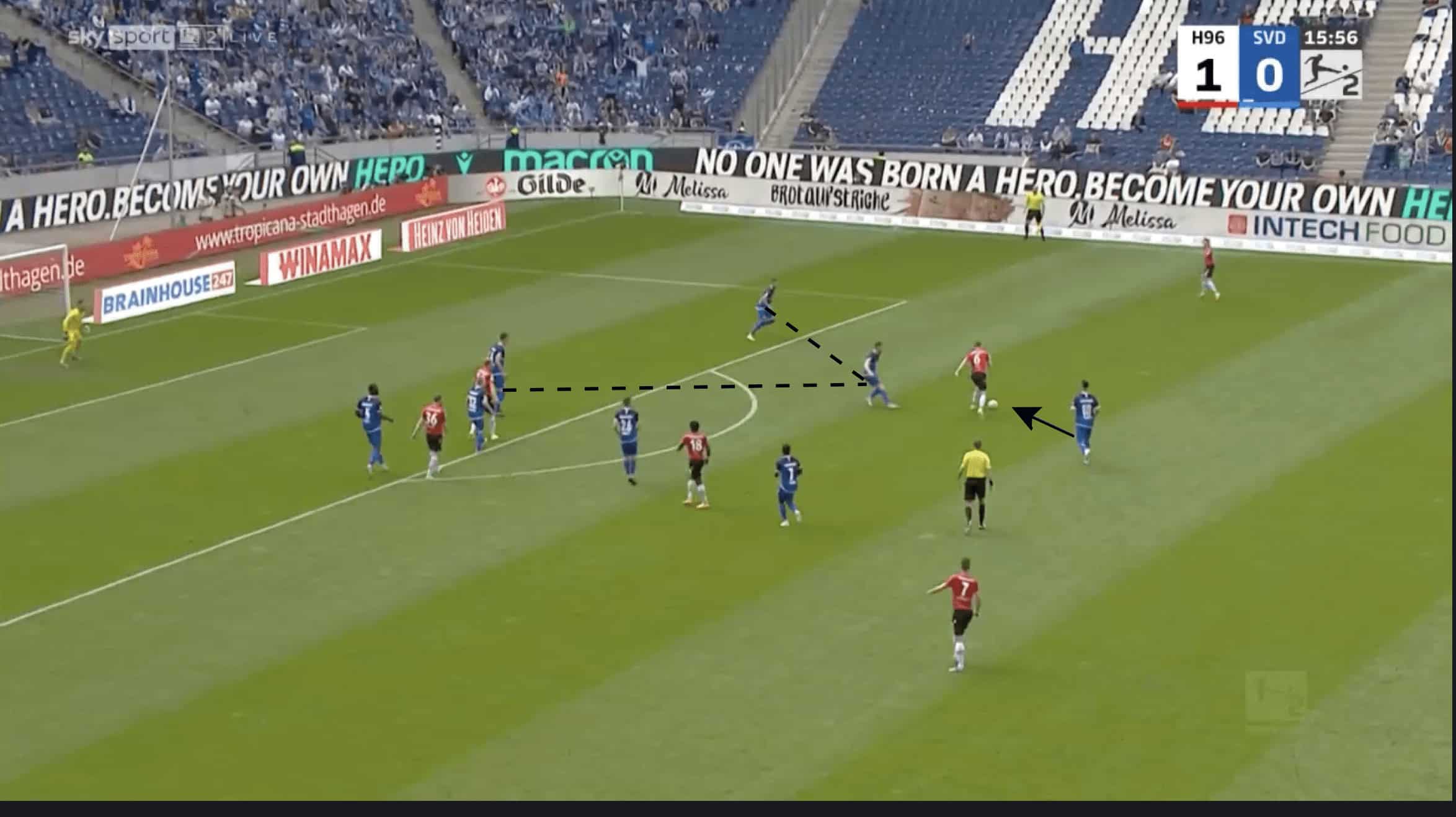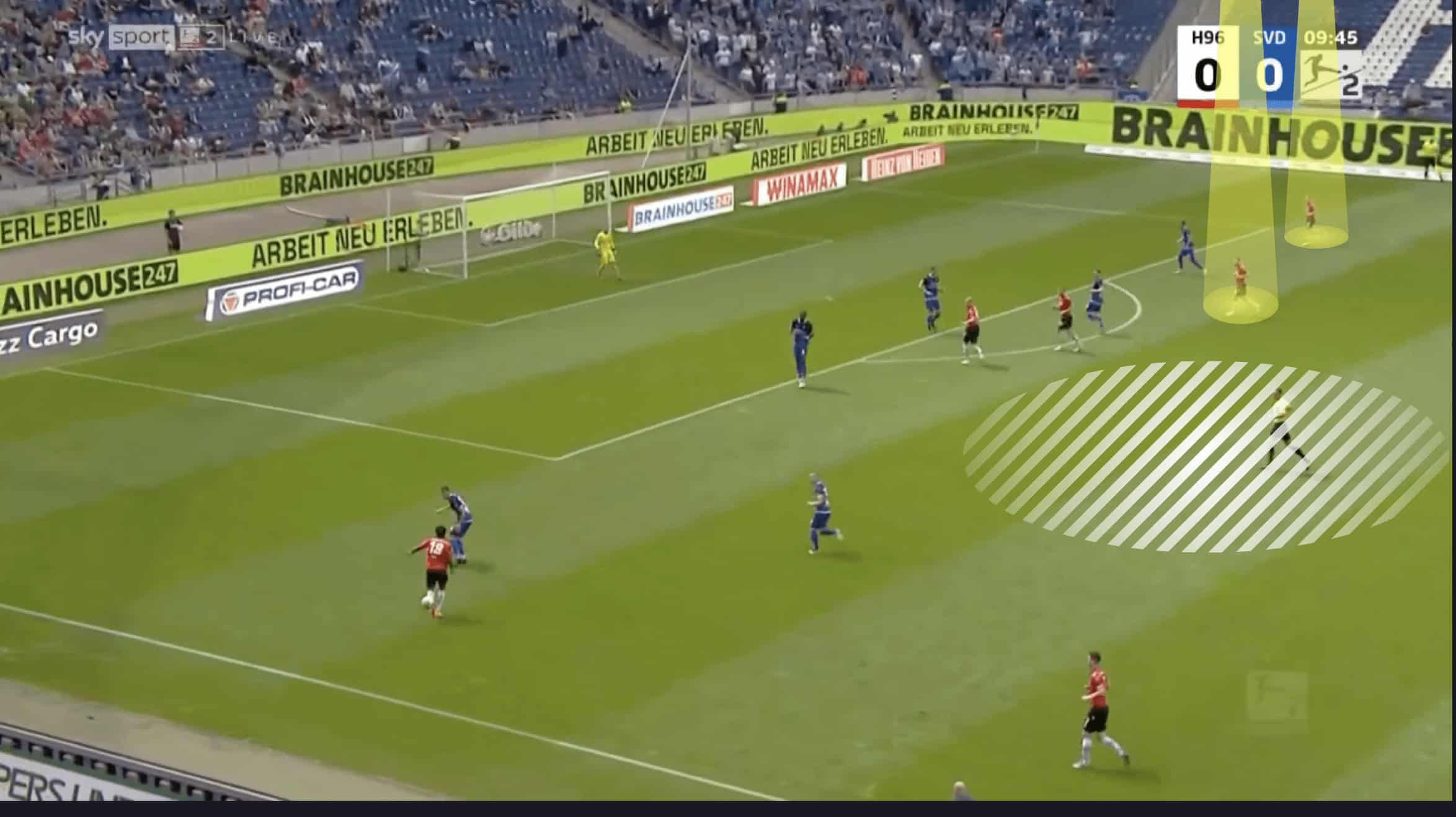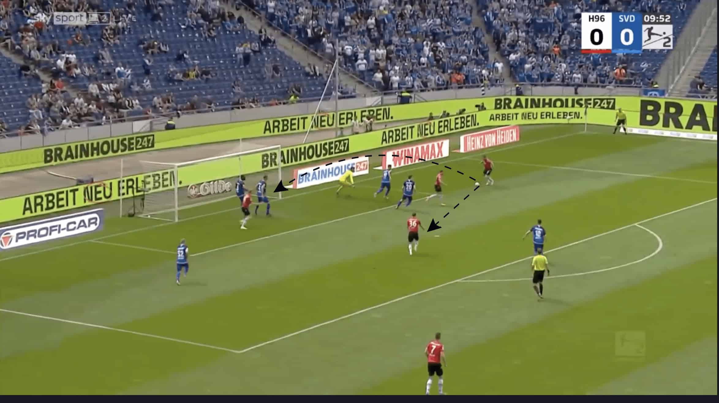 In the example below, in their game against Hannover, Torsten Lieberknecht’s tactics chose to use two players in their first line of defence.