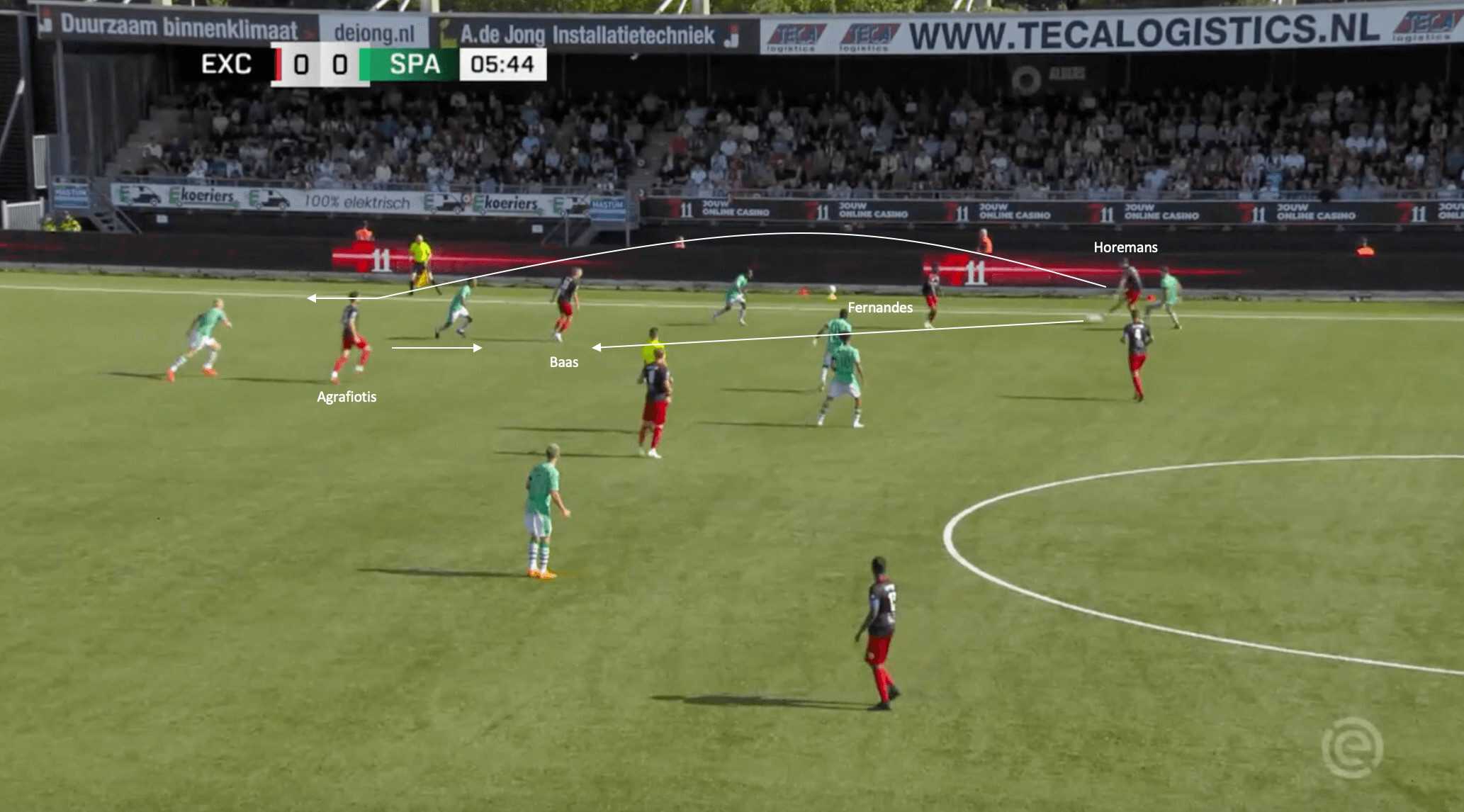 Agrafiotis attempts to play a one-two with Horemans, but unfortunately the Sparta defender is able to get a foot on the ball, knocking it out for a corner. What this example is able to show is the emphasis Marinus Dijkhuizen puts on his side to look to exploit the wide channels. From the overload being created to the attempted ball into the overlapping run of the fullback and the winger tucking inside, it shows how the wide channels have been a successful route of attack for Excelsior in the early days of this season, with more examples illustrating this tendency.