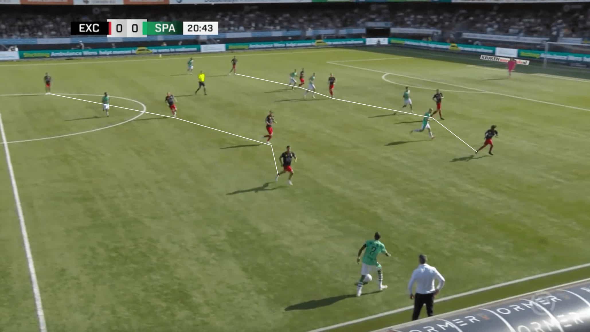 The image above shows an example of Excelsior able to use the full width to their advantage against Sparta Rotterdam in an attacking move. The move originates with a long ball from Excelsior goalkeeper Sitjn van Gassel. After a bit of bouncing around in the attacking third, the ball is able to find its way to right back Siebe Horemans, who has moved into a more advanced position and keeps the width, allowing Fernandes to tuck inside and be narrow.