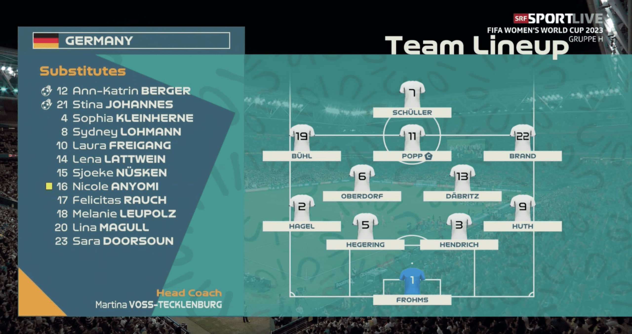 Chantal Hagel, primarily a midfielder, came in at left-back for both games as Felicitas Rauch suffered an injury in training. Additionally, the vastly experienced Marina Hegering replaced Sara Doorsoun for the final group game as the Eintracht Frankfurt defender picked up an injury in the Colombia game.