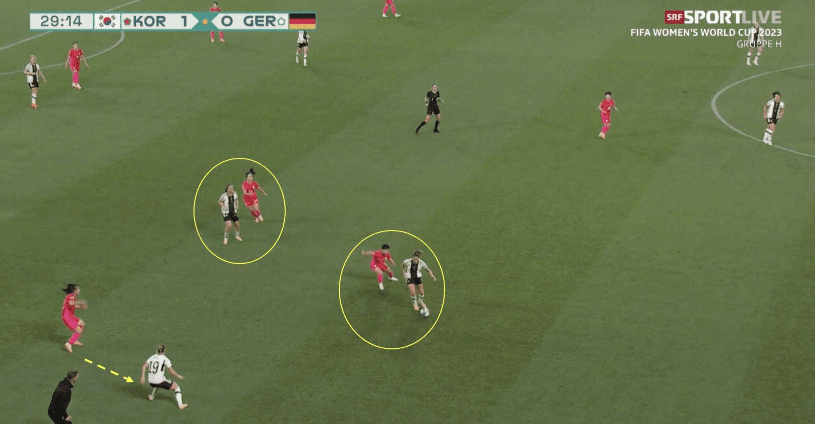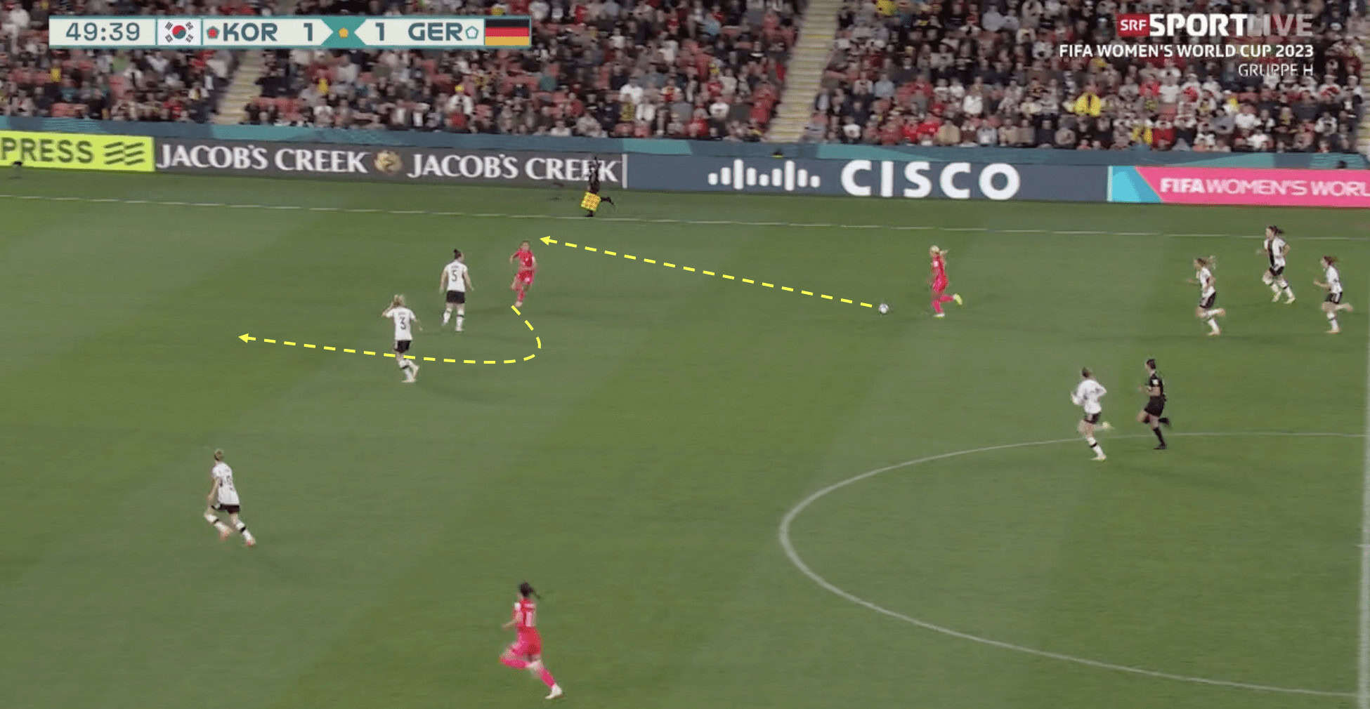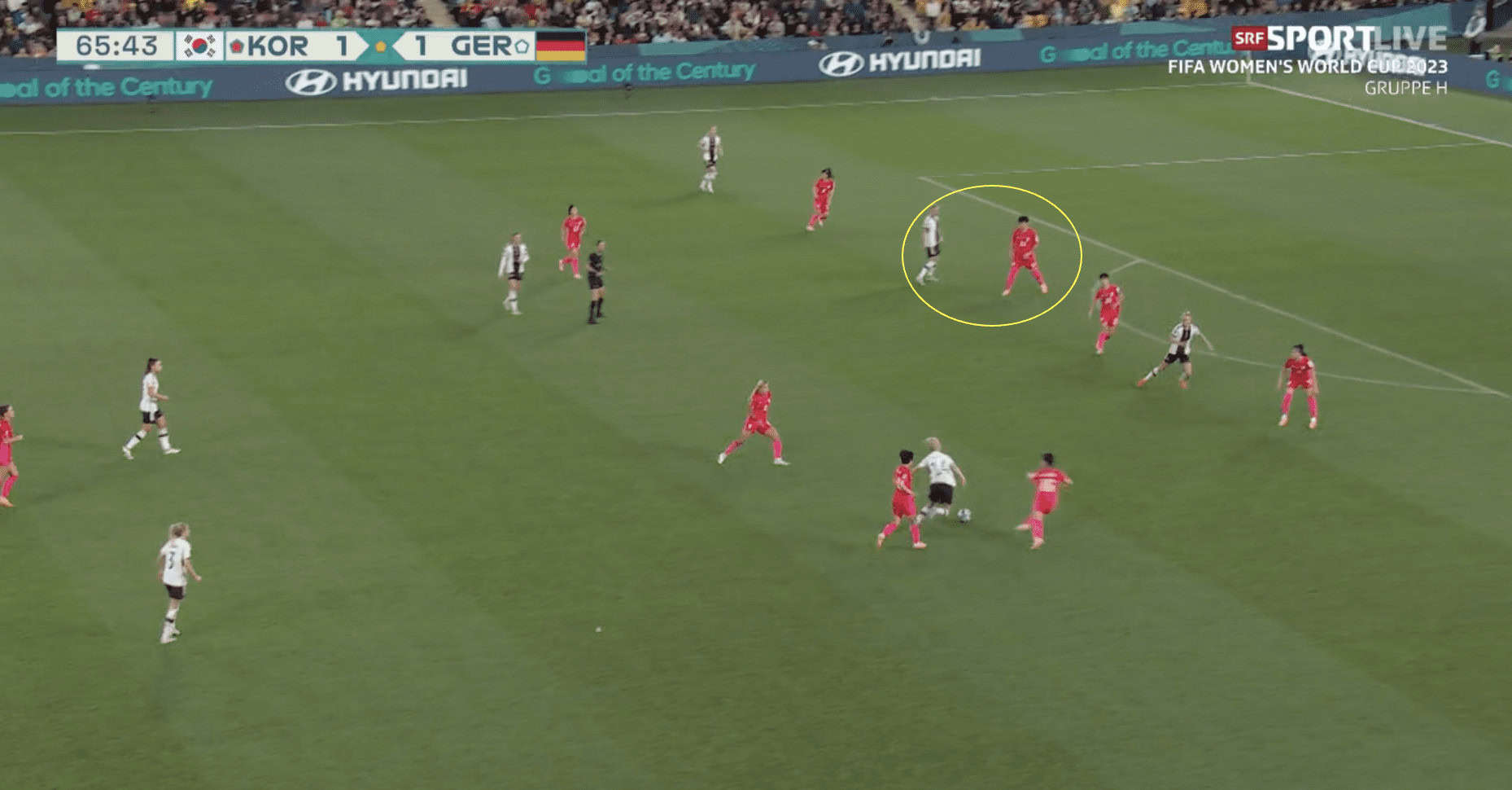 Midfielder Lena Oberdorf has also dropped back to try to mark a player whilst Bühl is in no man’s land, unsure whether to sit narrower or mark Choo Hyo-joo who has acres of space to run into. Instead, the South Koreans opt to play a defence-splitting pass to Cho So-huyn, who calmly placed the ball beyond Frohms.