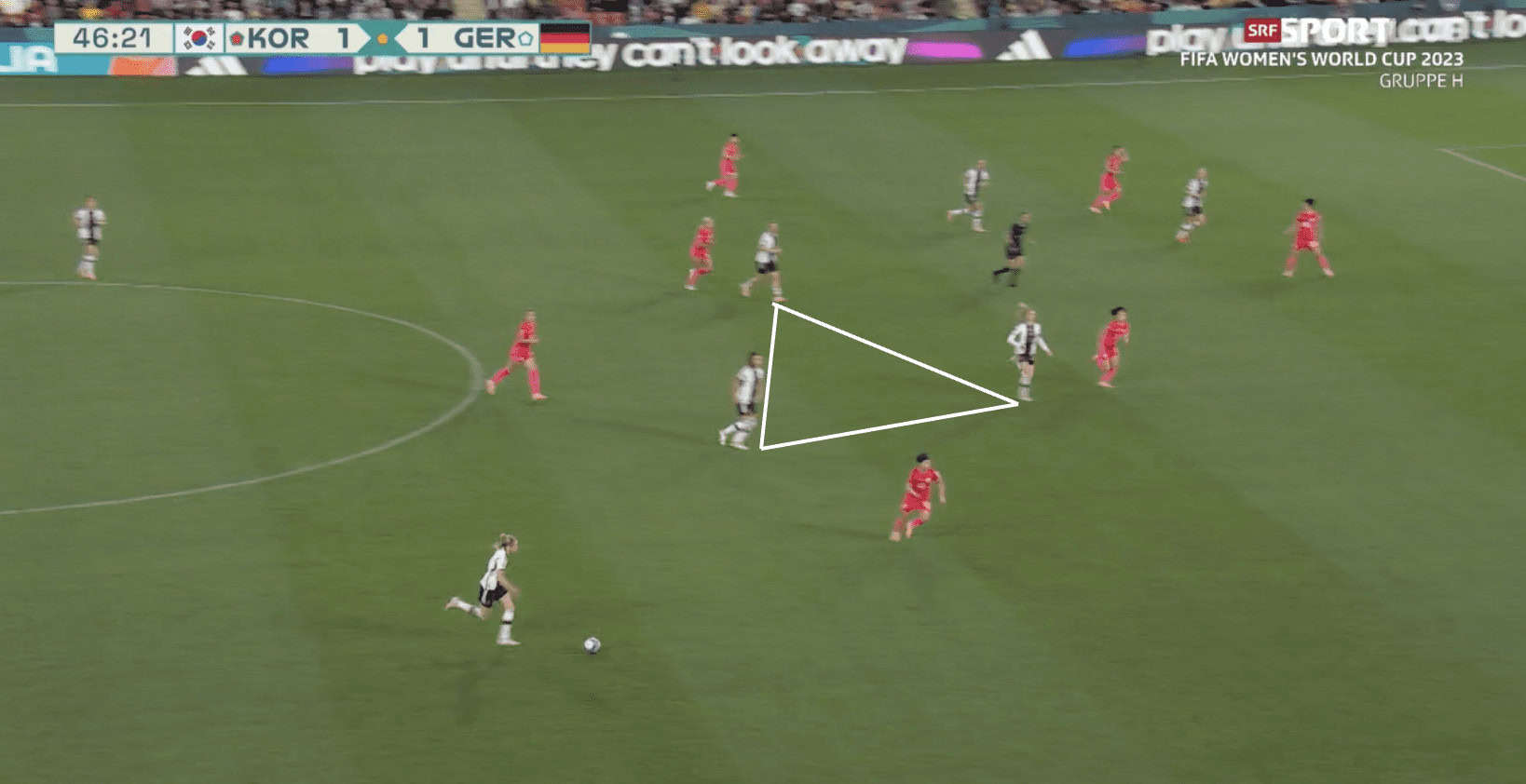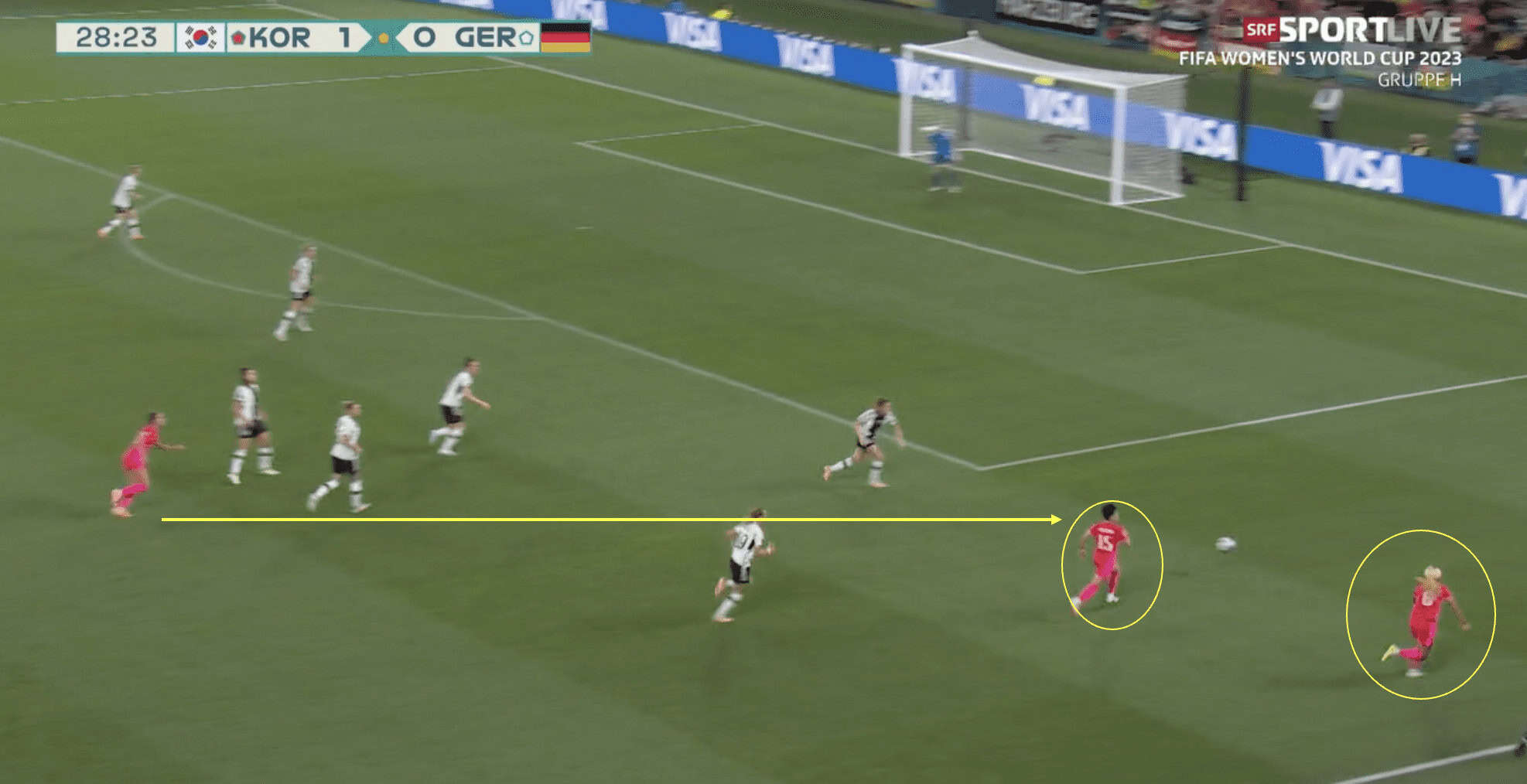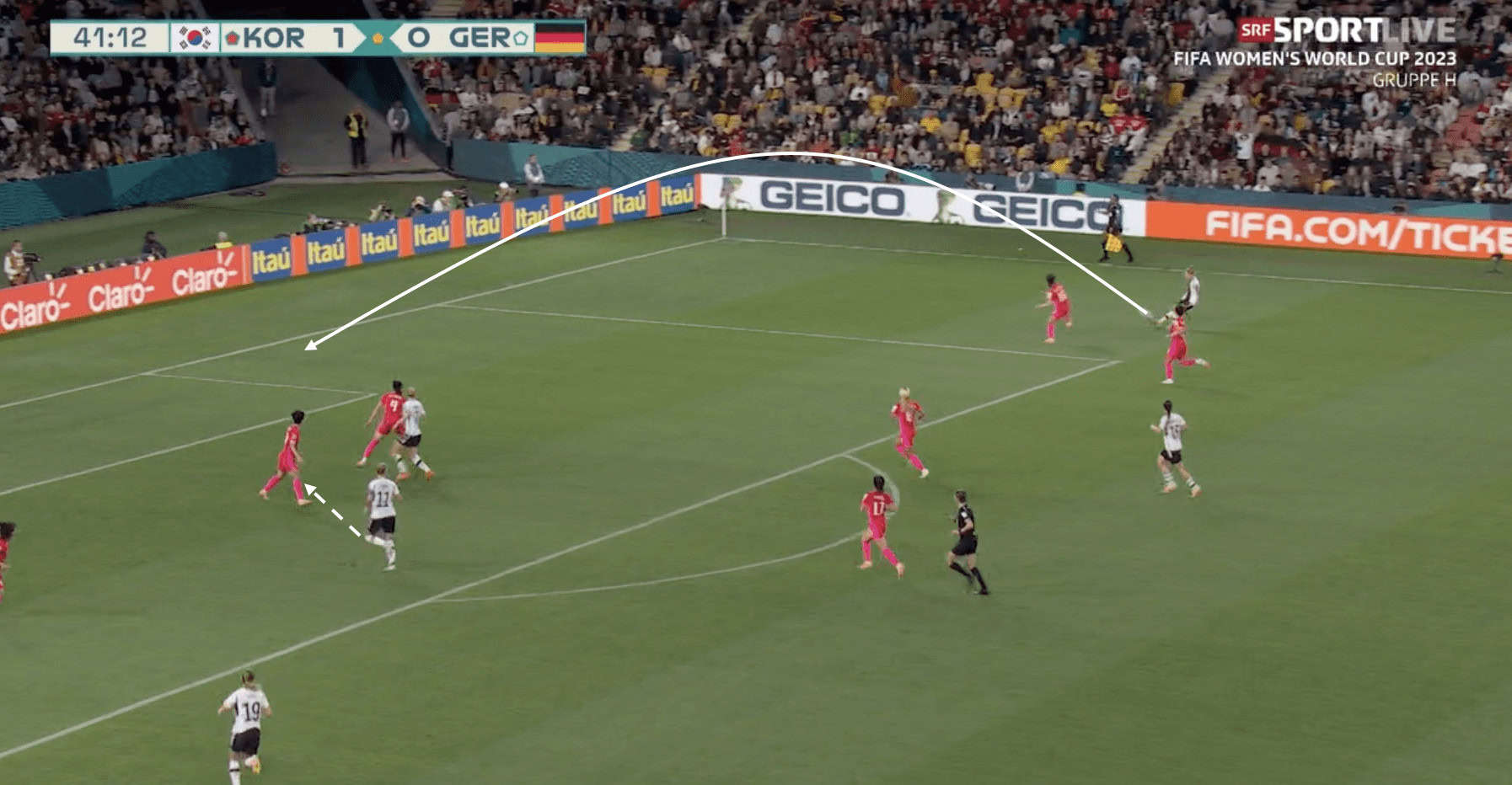 Midfielder Lena Oberdorf has also dropped back to try to mark a player whilst Bühl is in no man’s land, unsure whether to sit narrower or mark Choo Hyo-joo who has acres of space to run into. Instead, the South Koreans opt to play a defence-splitting pass to Cho So-huyn, who calmly placed the ball beyond Frohms.