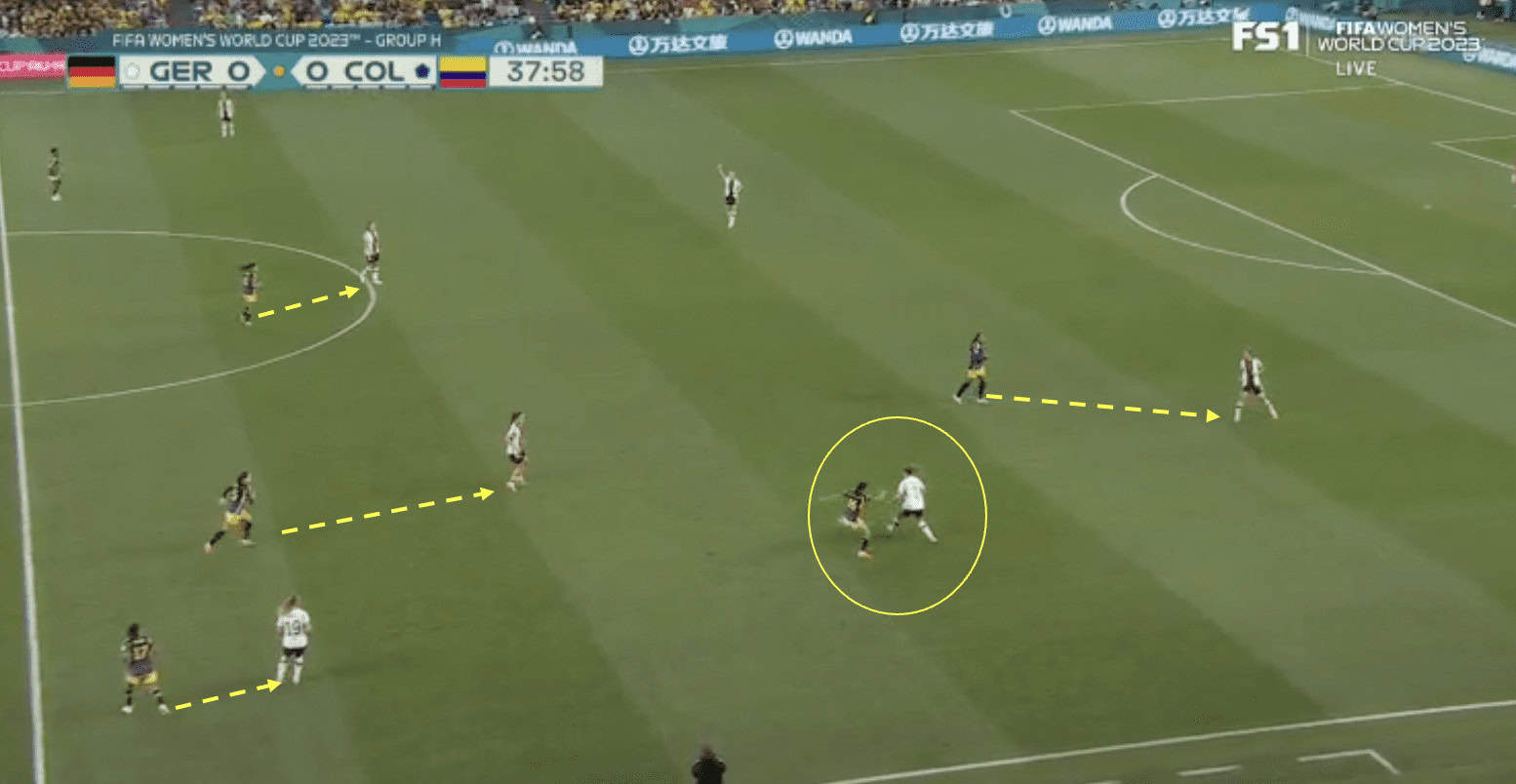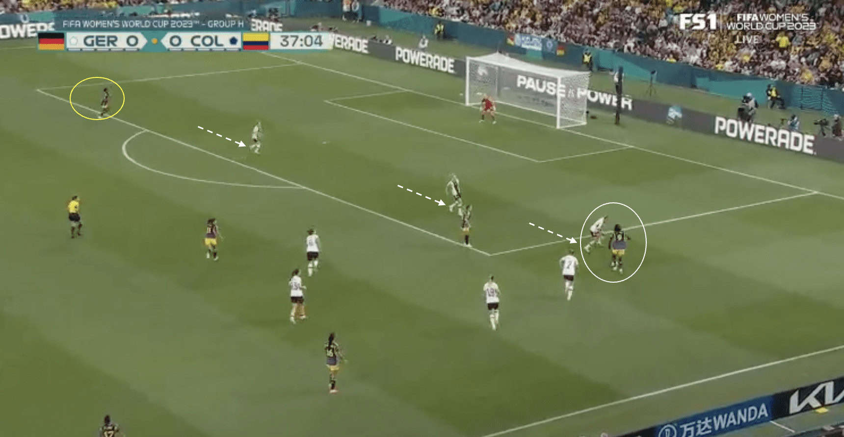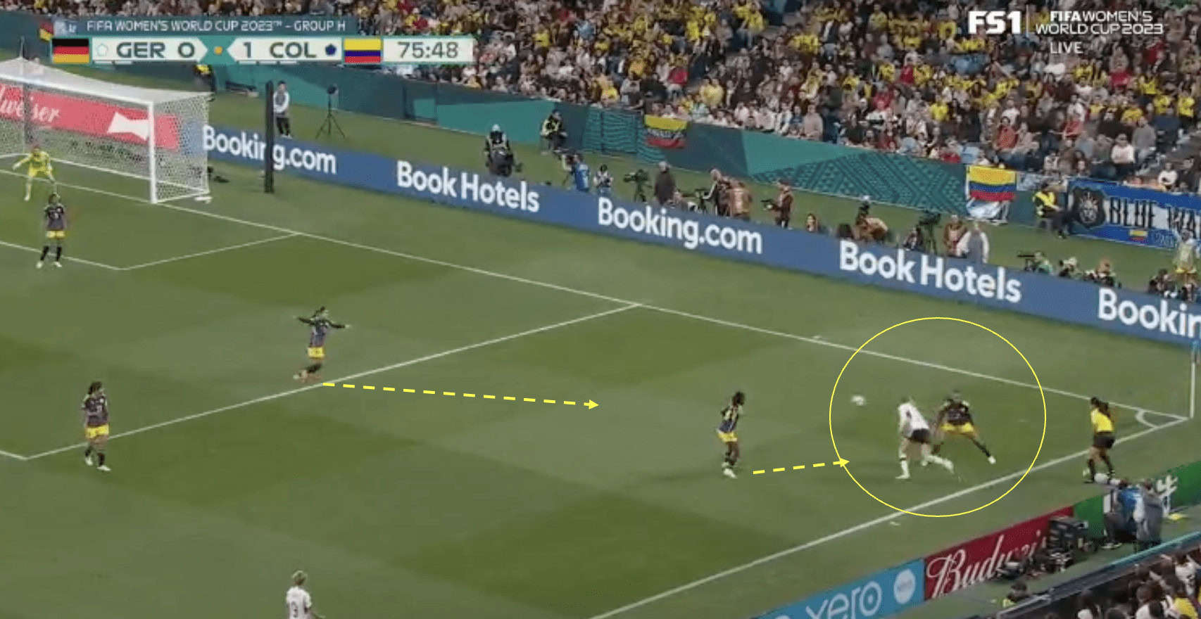 A similar scenario played out in the Colombia game, as shown below. Hagel, the German number 2, cannot prevent Ramirez from going past her, which then causes the German back line to shift across, leaving Linda Caicedo virtually unmarked for Colombia.
