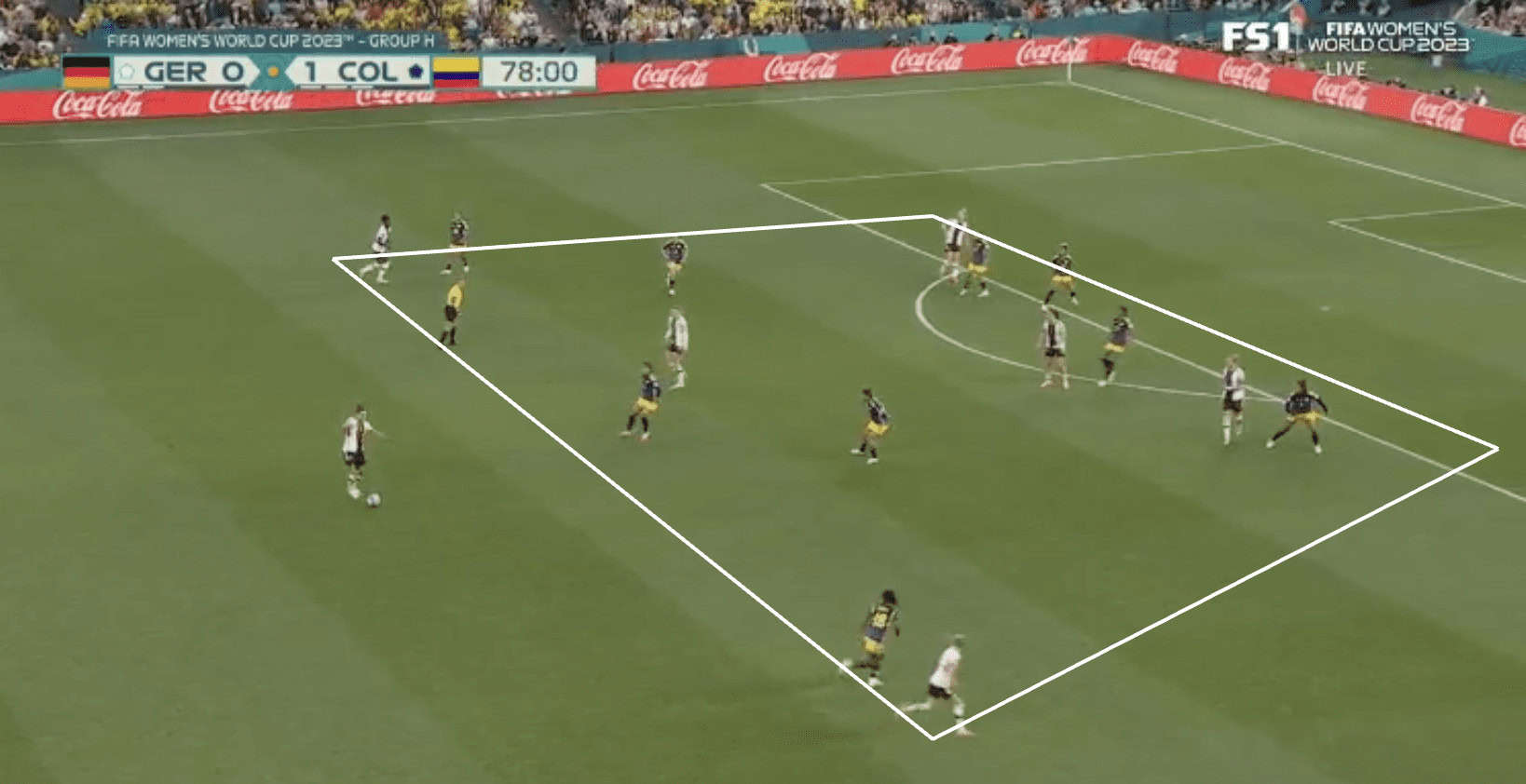 As a result, Germany often played relatively narrow, as seen in the image below. This enabled Colombia to comfortably defend their attacks for most of the game as they deployed two defensive midfielders who could prevent the likes of former PSG midfielder Sara Däbritz from having any influence on the game.