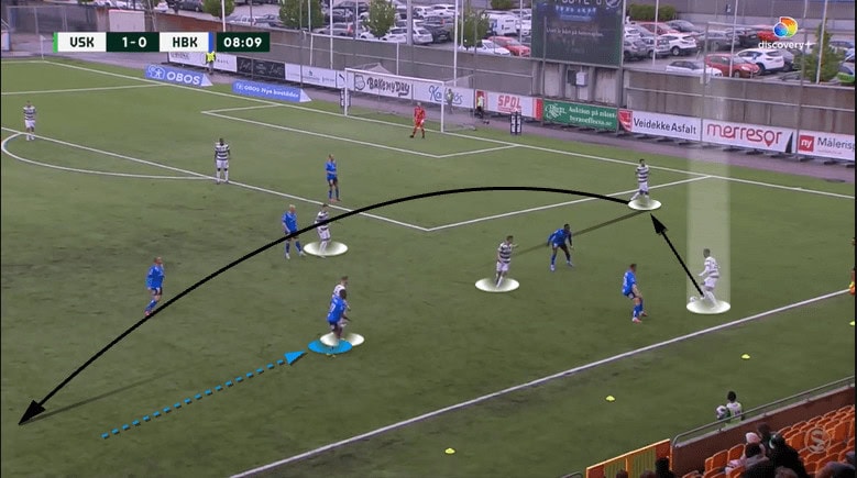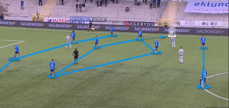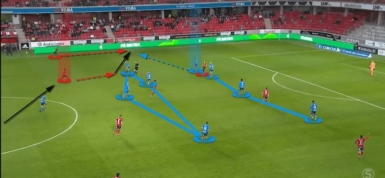 However, an issue that arises for the full-backs is when the ball is played backwards and quickly switched to the oppositions wide-forward from a long diagonal. With the entire midfield and both forwards on one side of the pitch, this leaves them exposed. Halmstad conceded from this situation in their previous match when their right-back was stranded in a one-on-one situation after a switch of play.